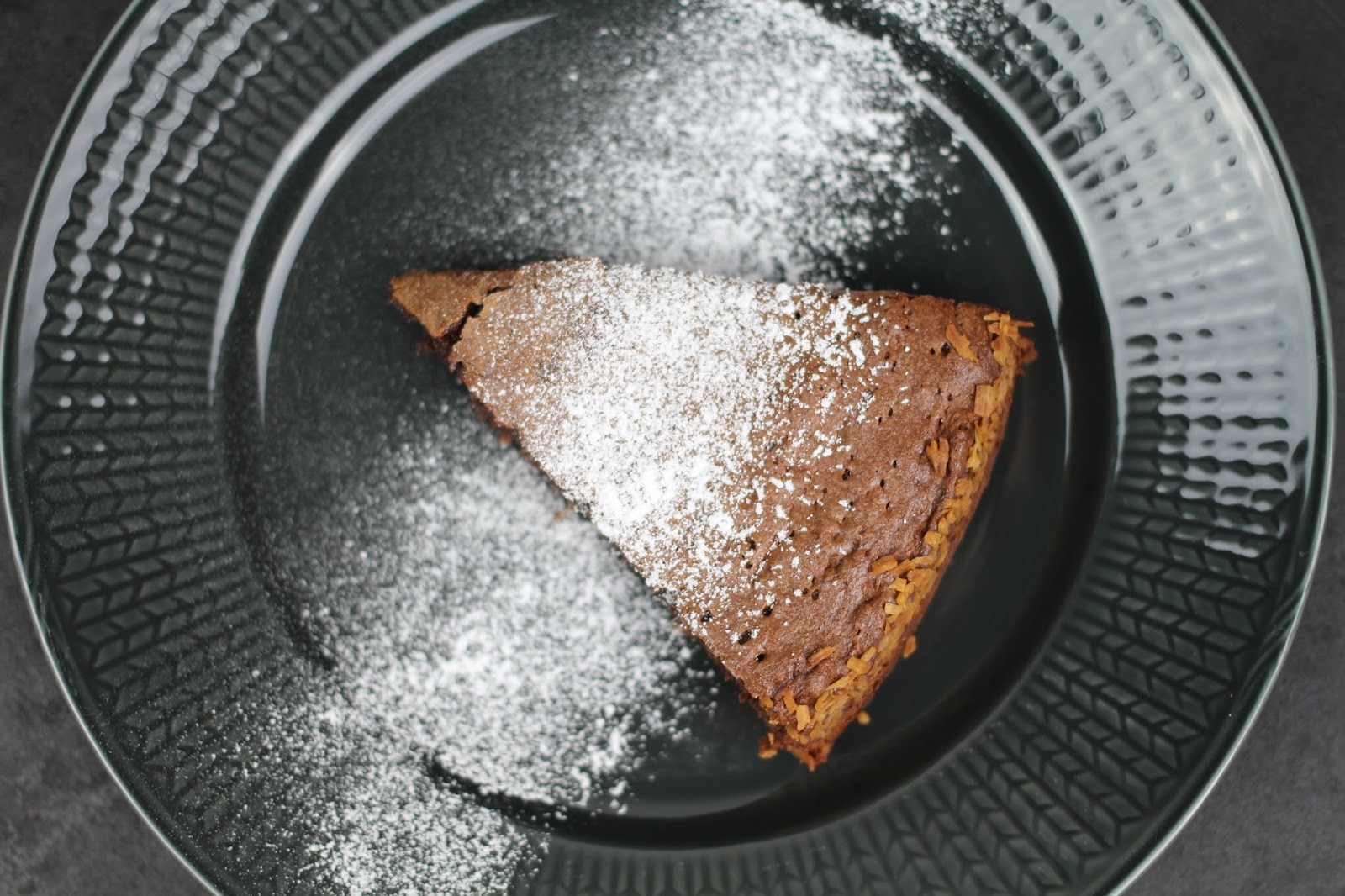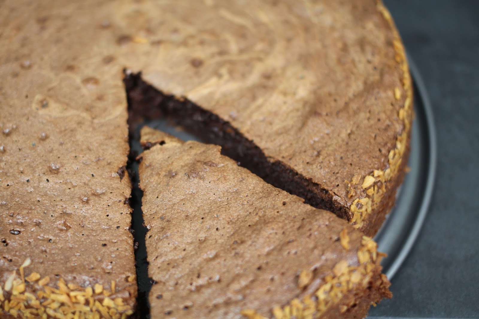 Bröa en springform med smör eller kokosolja samt kokosflingor. Smält smöret och låt det svalna lite. Vispa ägg och socker fluffigt, vispa sedan ner sirapen. Tillsätt det avsvalnade smöret och sikta ner mjöl, kakao, vaniljpulver och salt. Grädda i nedre delen av ugnen, på 150 grader, i ca 10-25 minuter (kan variera väldigt mycket), så den är klar längst ut i kanten men kladdig i mitten.