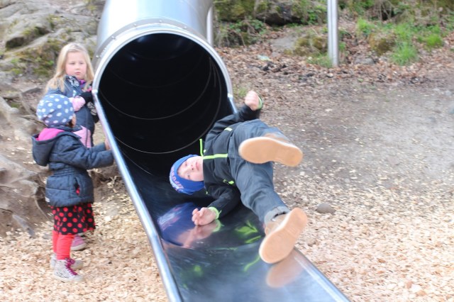 | Hahaha, dagens roligaste kort, fångade Oliver på bild när han kommer FLYGANDE ut ur en jättelång rutschkana, det här alltså i FULL fart!! |