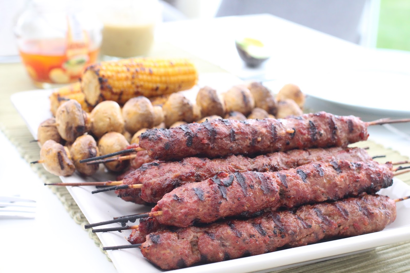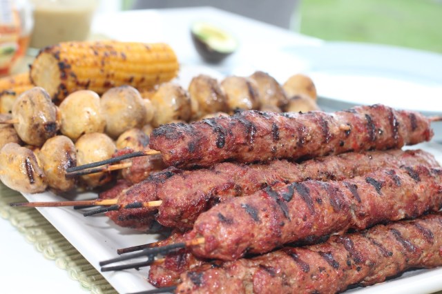 Blanda ihop smeten och smaka av så den är lagom kryddad. Blöt sedan händerna med kallt vatten och forma en ”korv” runt ett grillspett. Grilla, men bara så att de precis blir färdiga, för att de inte ska bli torra. Vi serverade dem med grillade svampspett och grillade majskolvar, bland annat.