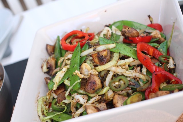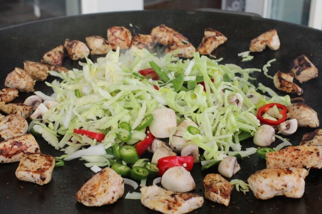 När du flyttat undan kycklingen så häller du på lite till olja på Muurikkan och lägger sedan i hela grönsaksblandningen. Salta och peppra, och stek på hög värme i ett par minuter – vi vill att kålen mjuknar lite men att sockerärtorna ändå är lite krispiga!