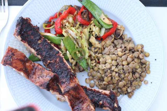 | Jag och maken tog revben istället för kyckling, de grillade vi på den vanliga grillen. Det är inte lätt att äta revben när man inte har några framtänder, och Oliver gillar kycklingen bättre. |