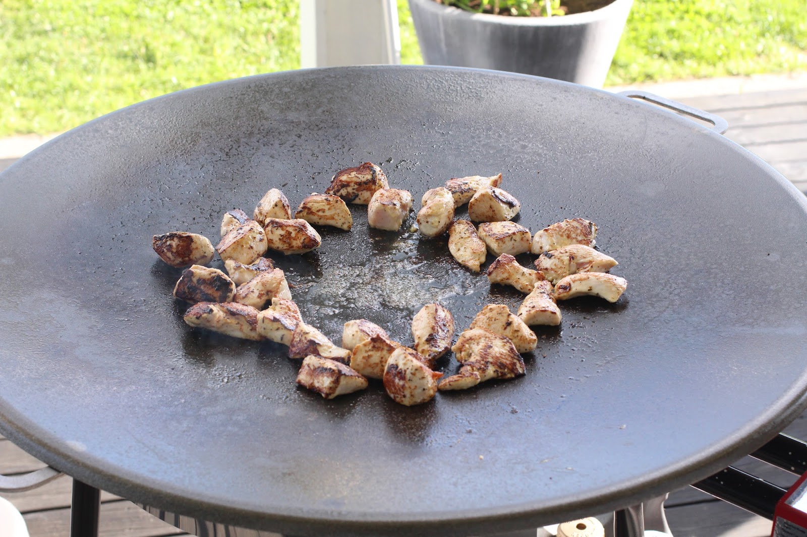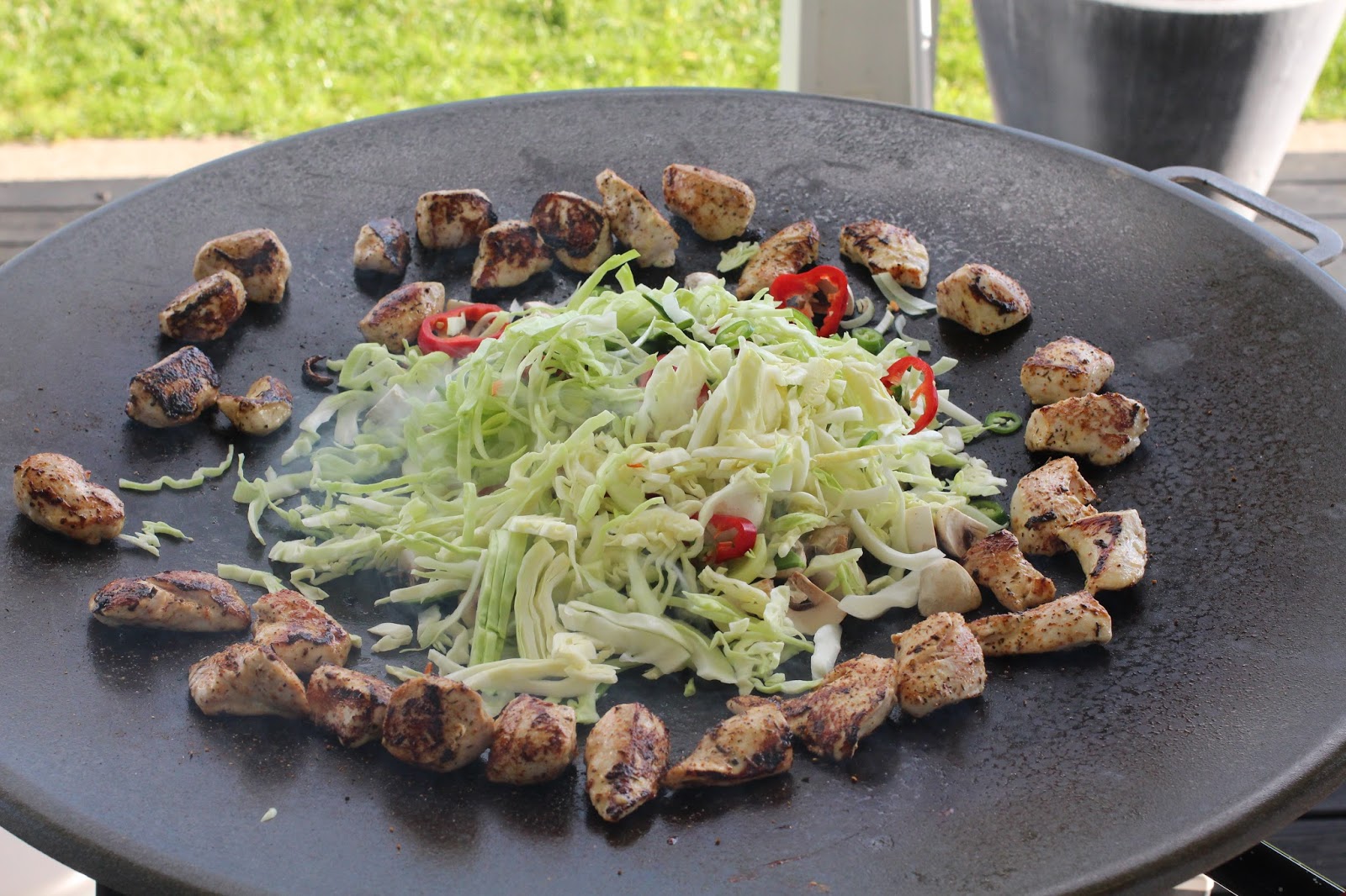 Nu kan man ju välja precis vilka grönsaker man vill till woken, det här var bara det jag valde denna gången. Muurikkan ger en grym stekyta och påminner lite om hur man använder stekbord på restauranger (ni har säkert sett hur de gör när man är på ett sånt där asiatiskt wookställe). Dessutom blir det också på något sätt en ”utomhussmak” på maten – OCH man slipper allt stekos inne! Win-win!