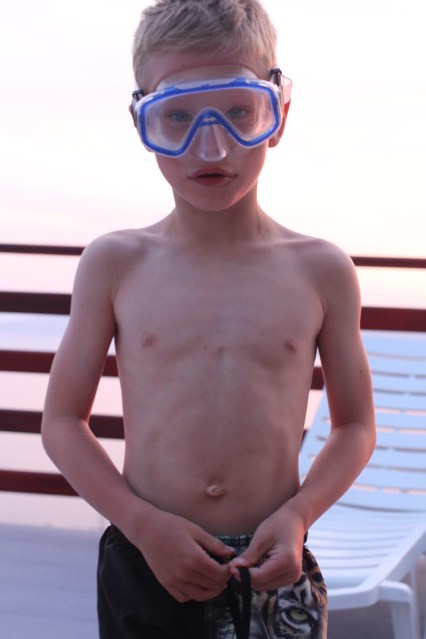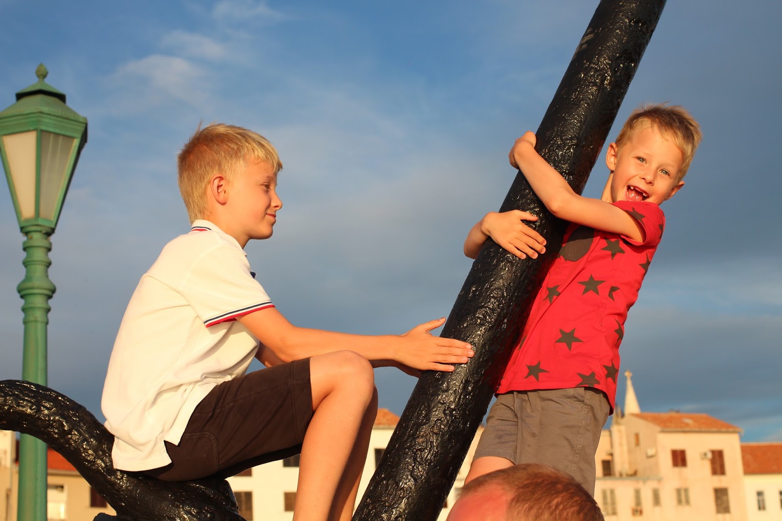 Någon form av rutin har utkristalliserat sig, vi åker ner till stranden vid 10, efter frukost, och sen badar och solar vi fram till max kl 13, därefter GÅR det inte vara i solen, och vi vill ju heller inte bränna vare sig oss eller barnen. Efter ett par dagars rejäl blåst där temperaturen höll sig på 26, 27 grader så har det blåst in lite kallare vatten i havet, MEN, när man väl kommit i så måste jag säga att det är grymt skönt, för man behöver all kylning man kan få, och temperaturen ligger ändå inte under 25 grader (om jag jämför med poolen). Efter sol och bad så äter vi nån form av lunch, oftast hemmavid då den i så fall består av ost (camembert eller liknande), salami rustico och en bit bröd. Enkelt men supergott. Därefter blir det lite allmän slappar-tid, med barnen framför en film oftast, och vi segar med en bok eller bara degar, medans solen står som högst på himlen och är allmänt outhärdlig. Framåt 18-19 snåret drar vi oss ner mot stan för att äta lite gott, det har blivit allt från pizza (troligtvis den bästa jag ätit ska tilläggas) till risotto, musslor eller fisk. Barnen är rätt trevliga oftast, och äter en massa olika saker, även om inte allt går hem. Men visst, det börjar märkas på dem oxå nu att de är lite uttråkade och ”tetiga”, vilket tar en del på vårt tålamod.