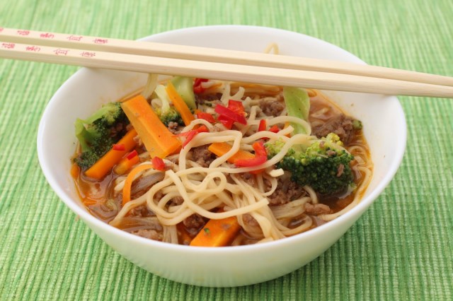 Lägg till löken till köttfärsen och stek på den ett par minuter till. Häll över i en STOR kastrull, tillsätt vatten och resten av ingredienserna förutom nudlarna. Smaka av med samma kryddor du använde till köttfärsen, och när det smakar bra lägger du ner nudlarna och låter dem koka med så länge som de ska koka.