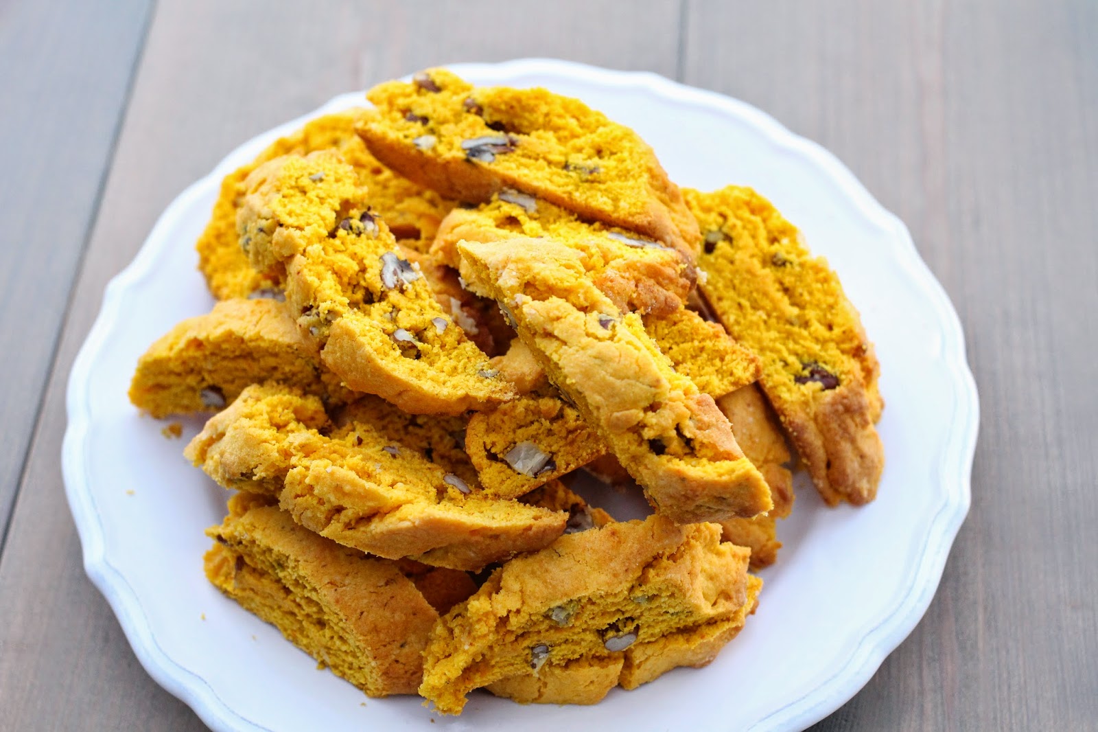 Vispa ägg och socker poröst, och rör sedan ihop med alla övriga ingredienser (smidigt med degkrokar på vispen eller i en kitchen aid). Smeten blev ganska kletig, men använd lite mjöl för att forma två långa ”korvar” på en plåt. Grädda på 200 grader i 15-20 minuter, ta sedan ut och skär meddetsamma i lagom stora biscottis.