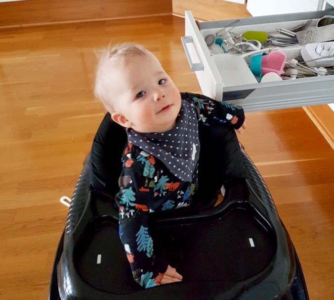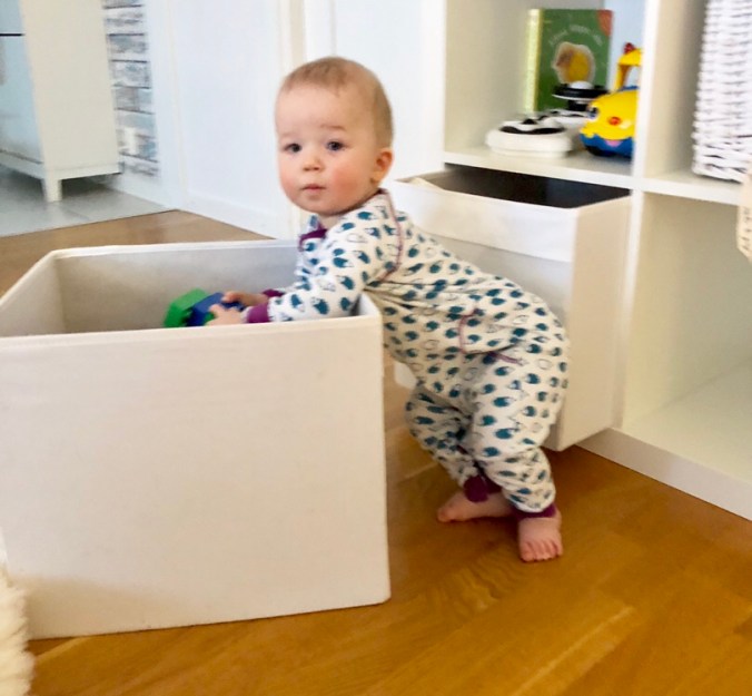 Suddig mobilbild, men den här lilla killen har till slut fattat mod till sig och börjat ställa sig mot saker själv, innan har han bara stått om vi ställt honom någonstans. Men han är vääääldigt försiktig av sig, lite läskigt är det minsann 😉 Skönt det, tycker vi föräldrar!
