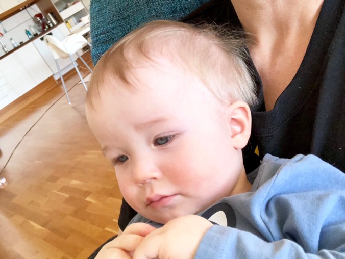 Han har ju inte haft så mycket feber sen han föddes, men vi har ändå kommit fram till två saker, han gillar inte vare sig Alvedon eller Ipren och han har en tendens att kaskadkräkas när han får feber. Det senare orsakade två olyckor i natt och där emellan har han legat på mig och varit ledsen, så de längsta stunderna med sammanhängande sömn för mig har varit ungefär en kvart. Jag känner mig lätt grötig idag och har dessutom nackspärr p.g.a. bebis på mig och då har jag sovit kasst EN natt, inte fyra år i sträck som med de andra barnen…