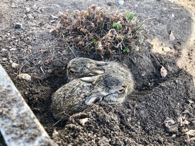 Alltså jag DÖR lite… Vi har en hare som bott i och runt vår trädgård och nu i morse låg hon i vårt land och gottade sig i solen. Efter en stund skuttade hon i väg och då skulle jag in och hämta lite kaffe. Slängde ett öga där hon legat och där låg två små (nyfödda???) harungar i jorden! De är mindre än min handflata och sjukt söta… Men nu måste jag ju passa dem lite så det inte kommer en katt eller skata eller nåt! 🙈