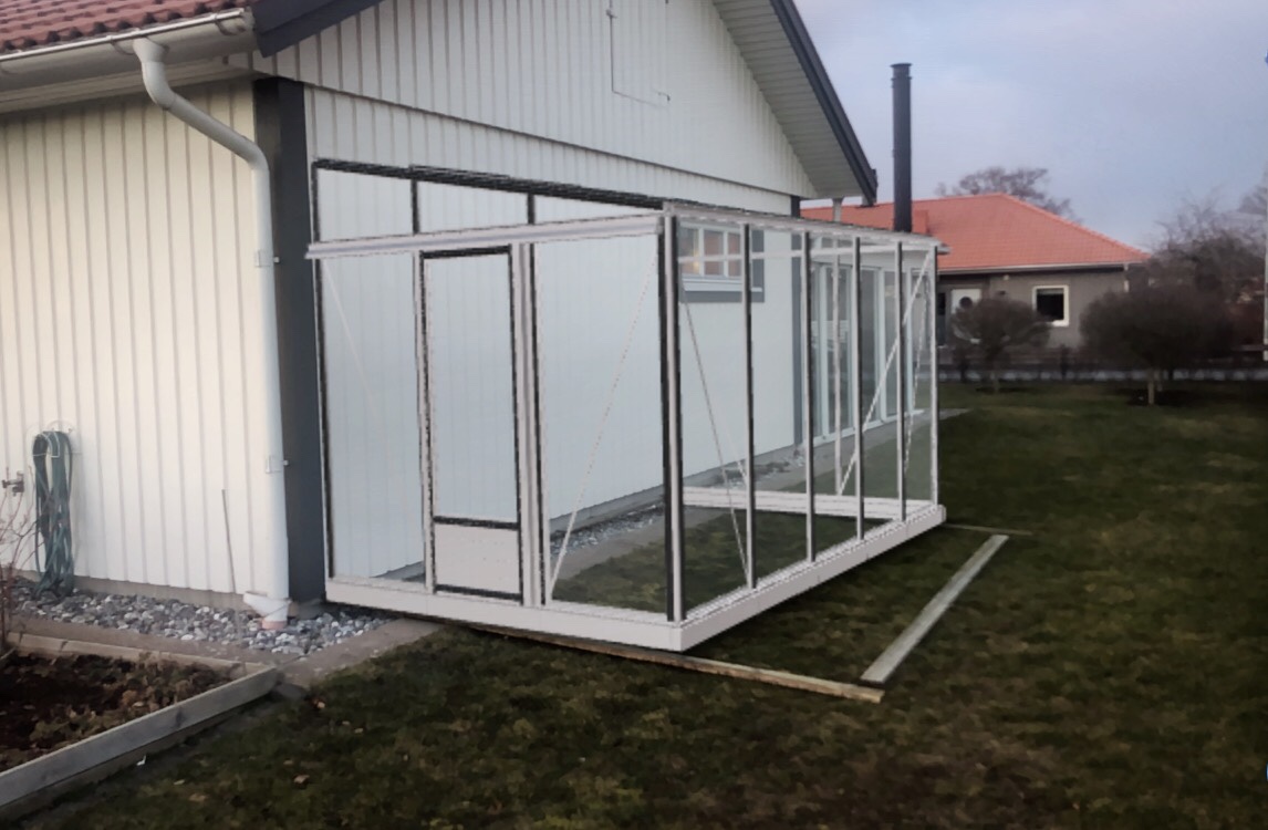 Men jag måste skriva om en helt annan sak, nu när vi inte fick köpa vår drömtomt så blev det ju himla deppigt, så vi började fundera på om vi kan göra något kul här hemma så länge. Vi kom fram till att ett växthus vore himla trevligt, men det finns verkligen ingen bra plats på tomten för ett fristående? Däremot så kom jag på att vi har en vägg i österläge med morgonsol där det skulle funka perfekt med ett vägg-växthus, det skulle få sol fram till tidig eftermiddag ungefär. Vi testade Willabs AR-app och det ser ut att kunna bli rätt bra? Eller vad tycker ni?