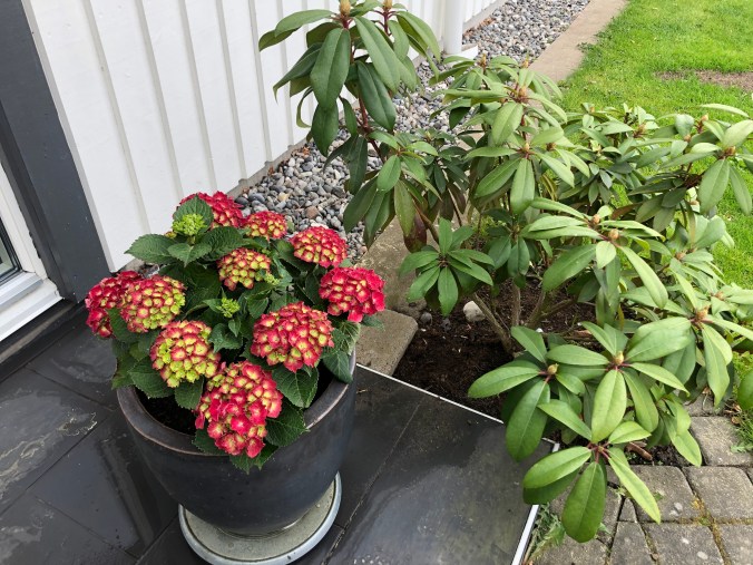Vid entrén har jag precis satt en hortensia och här bor även permanent en dvärg-rhododendron.