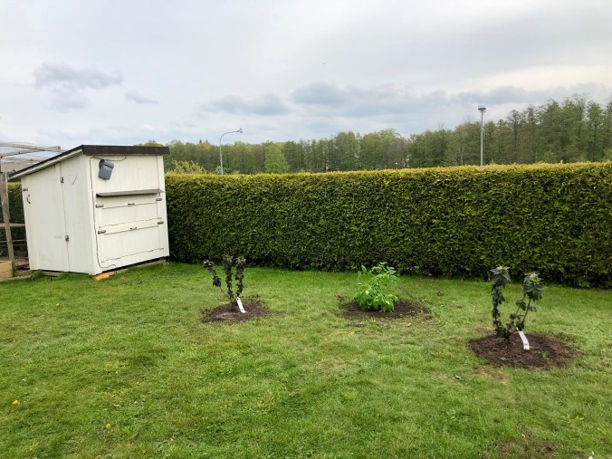 Närmast kameran är det potatis, till vänster en tidig sort (Timo tror jag) och till höger en helt röd potatis som heter Zoe. De har blivit rätt skadade av frosten som varit så jag hoppas verkligen de tar sig! Strax därefter står mina tre blåbär, varav den mittersta verkar ha lite svårt att ta sig efter jag flyttade den…