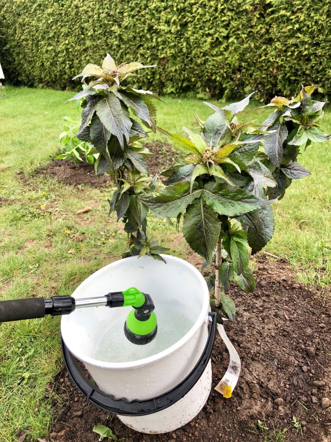 För övrigt ett superbra tips från skillnadens trädgård (Sara Bäckmo), när man behöver vattna lite större träd och buskar men vill slippa stå en lång stund och dessutom riskera att vattnet bara rinner iväg: ta en hink och borra några små hål i, fyll med vatten och så kommer det rinna ut i lagom takt!