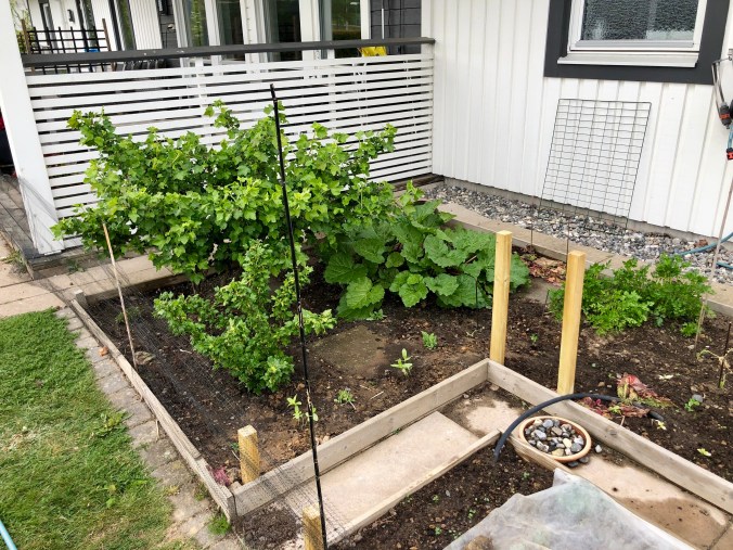 I landet bakom sandlådan är det från vänster till höger: mangold, dill & salladslök (tror dock inte den senare kommer ge nåt resultat), morötter och så vitlök samt ett vinbärsträd.