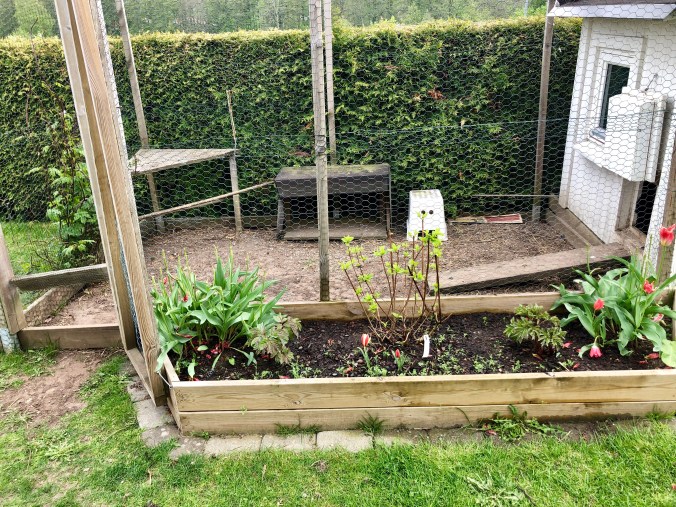 Utanför hönsgården växer Pinkie-Winkie i mitten, en syren-hortensia. Den flankeras av pioner och resterna av tulpaner.