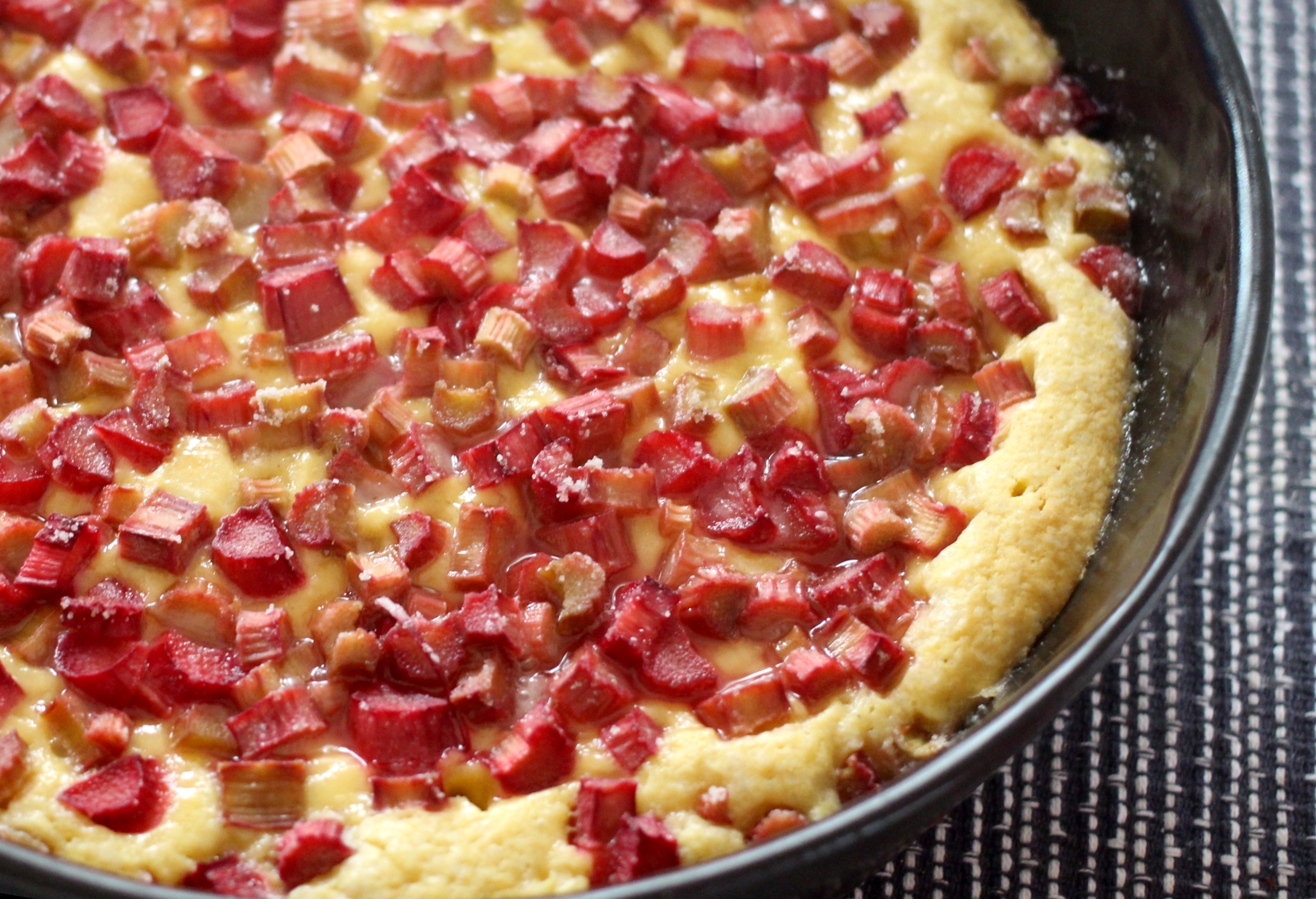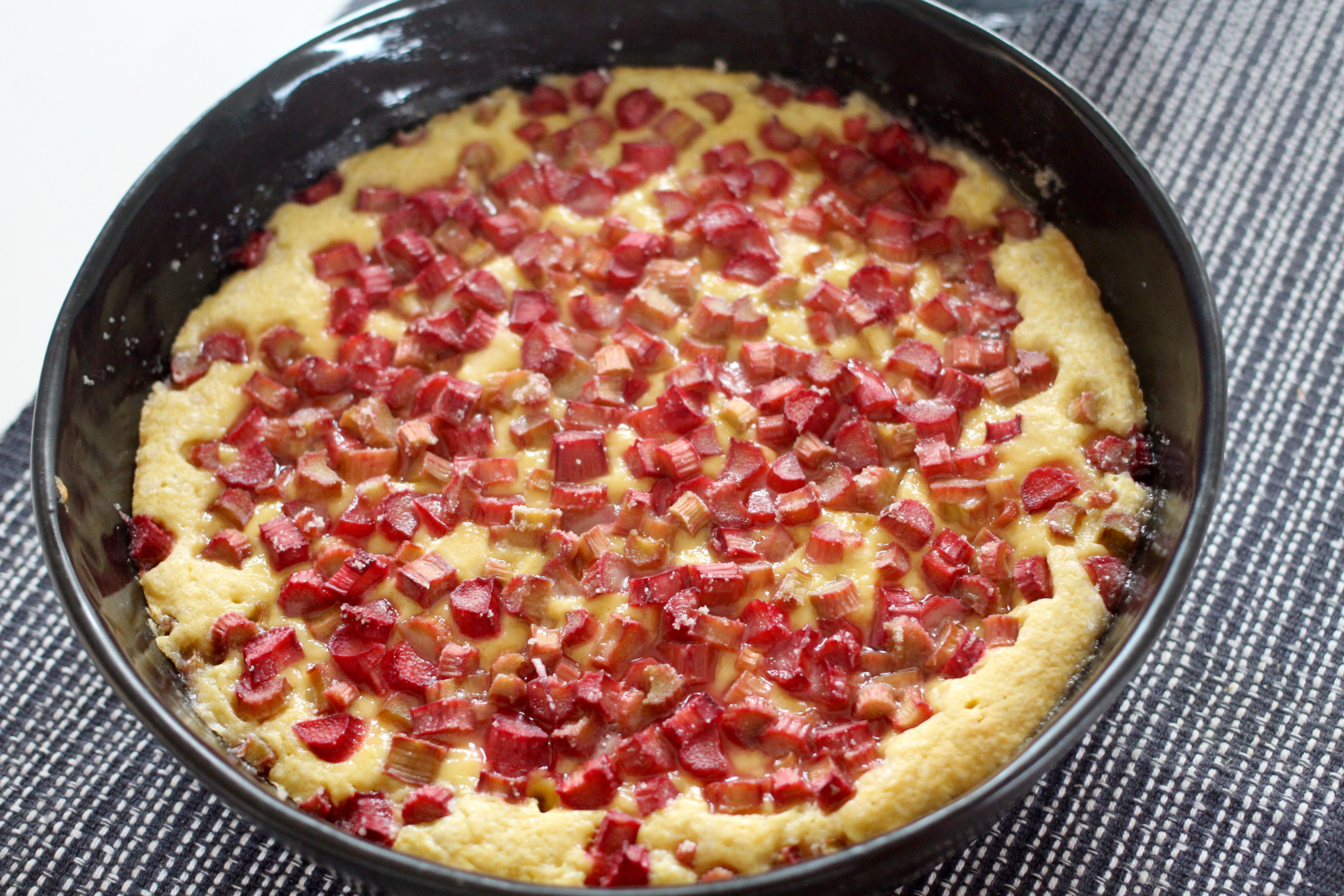 Ställ kakan mitt i ugnen och sänk temperaturen till 150 grader. Grädda i ca 30-40 minuter beroende på hur kladdig du vill ha kakan. Den blir ganska kompakt eftersom man inte har i något bakpulver, men det passar så himla bra till rabarbern!