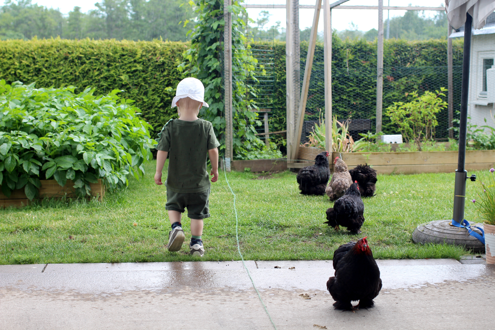 Lilla Filip fick hänga på dagis idag när brorsorna gick på skolavslutning, men nu är vi hemma och då kollar man så klart läget med hönorna först av allt!