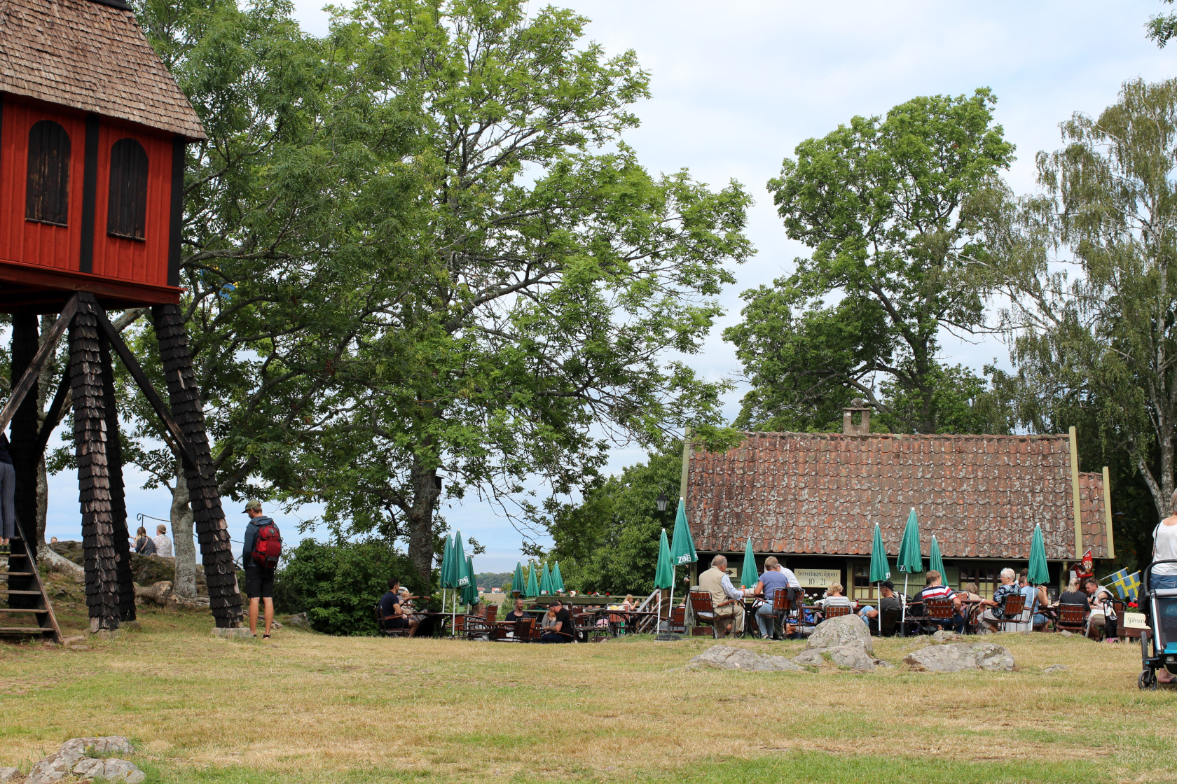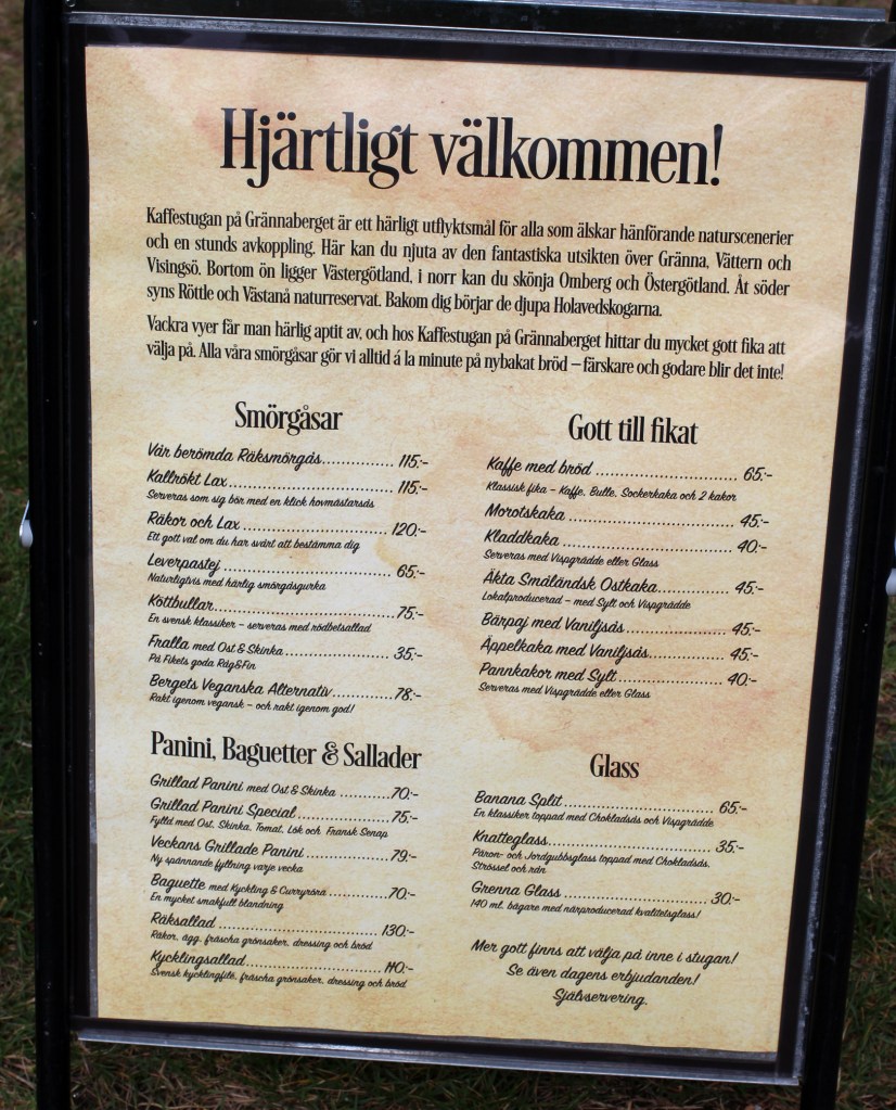 Deras specialitet är ju räkmackan, den tog vi och jag *tror* den var god men inget ”wow”. Tror för vi fick verkligen inte sitta ner nånting alls den här dagen, Filip bara kutade runt och försökte försvinna i trappor, nerför berg, bakom hus och under bilar. Hurra. Nåväl, hade sällskapet varit mindre flyktbenäget så hade vi nog gärna suttit och njutit en bra stund, för de hade ett bra utbud av lättare luncher och fika, men såklart även den fina utsikten över Gränna och Visingsö. Absolut ett trevligt utflyktsmål och även barnen gillade det – även om jag nog inte rekommenderar det till folk som har 2-åringar utan konsekvenstänk…