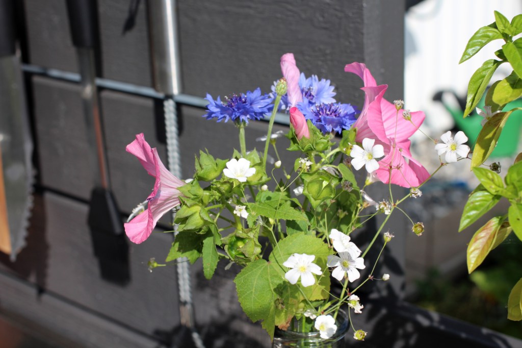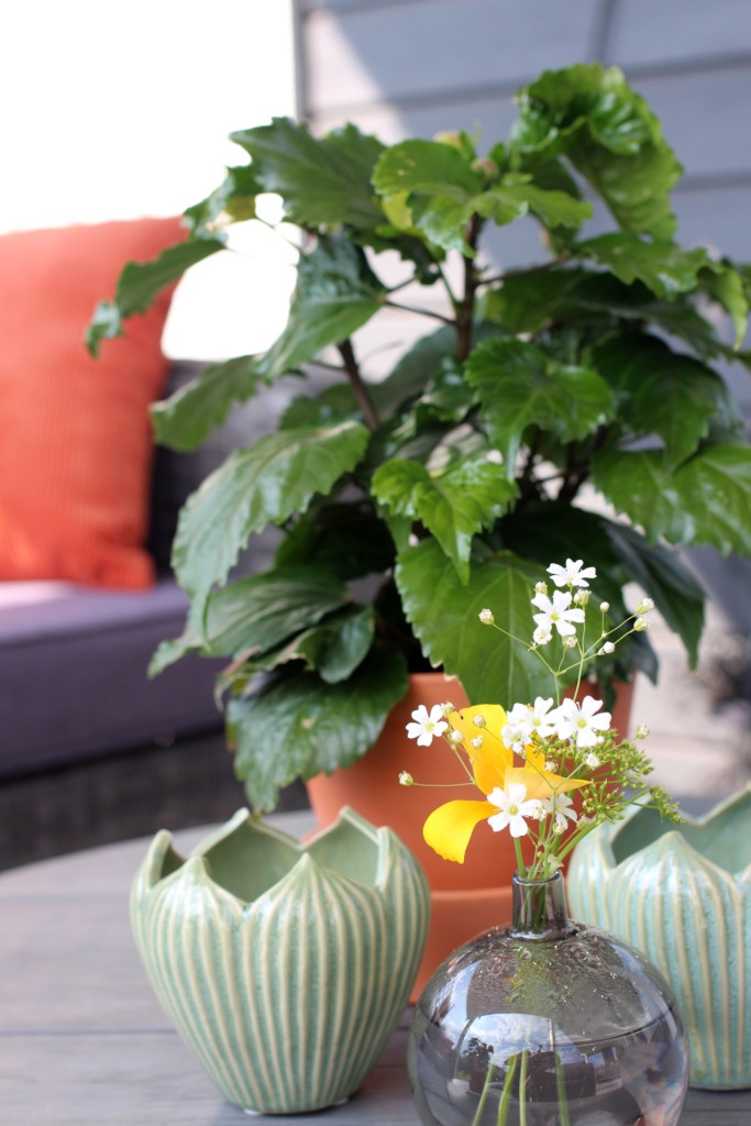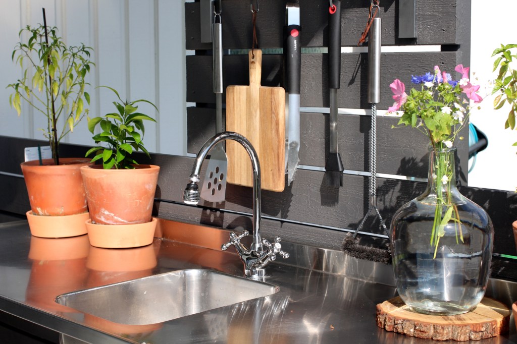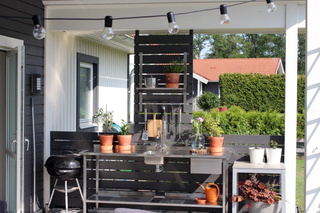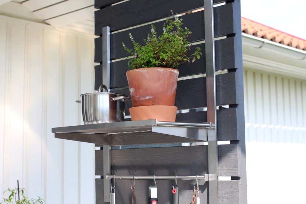 Typ så här ser den ut, här ser ni också hur altanen såg ut innan klinkers. En minivas med blommor från egna landet. Men låt oss kika vidare på uteköket! En rostfri stålbänk, en grill (som ska bytas ut) och lite avlastningsytor. Yes, vatten påkopplat via vattenutkastet på baksidan, spillvattnet rinner ut direkt i landet bakom. Men som med allt är det ju detaljerna som gör helheten! Det blev en rostfri hylla och stång från IKEA som lyfte det hela. Mer blommor från landen!Marockansk mynta har hittat en perfekt plats här. Valde fina terrakotta-krukor för att ge lite liv, värme och medelhavskänsla – förstärkt av klinkersen.