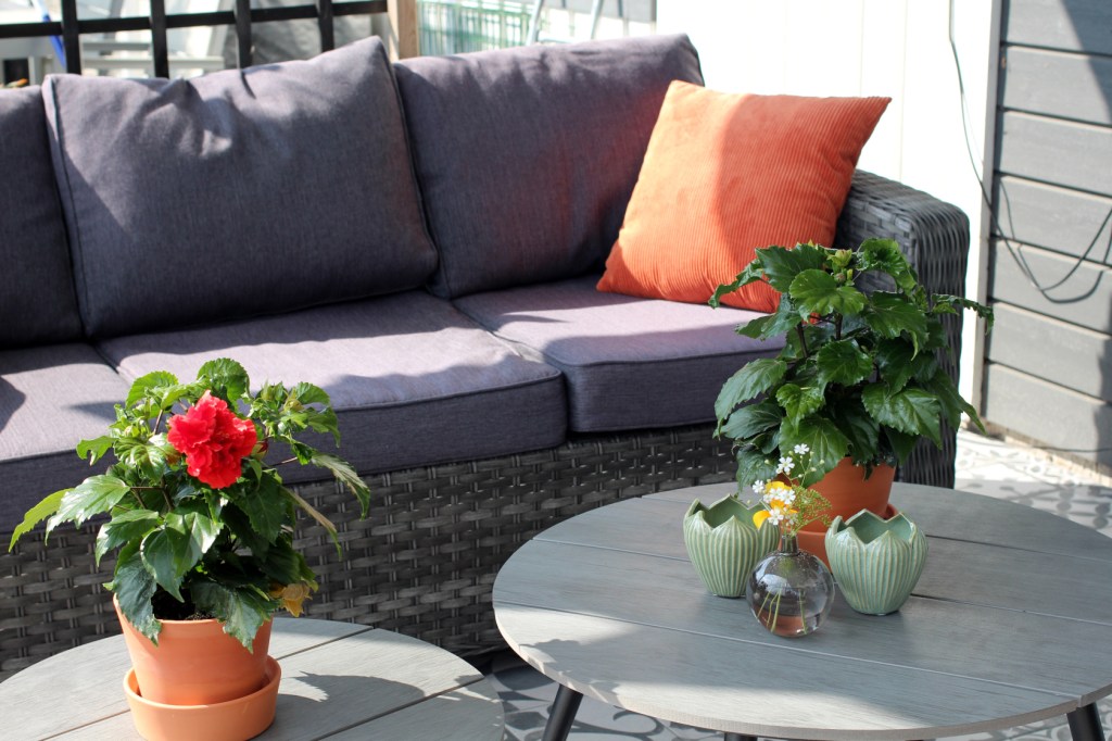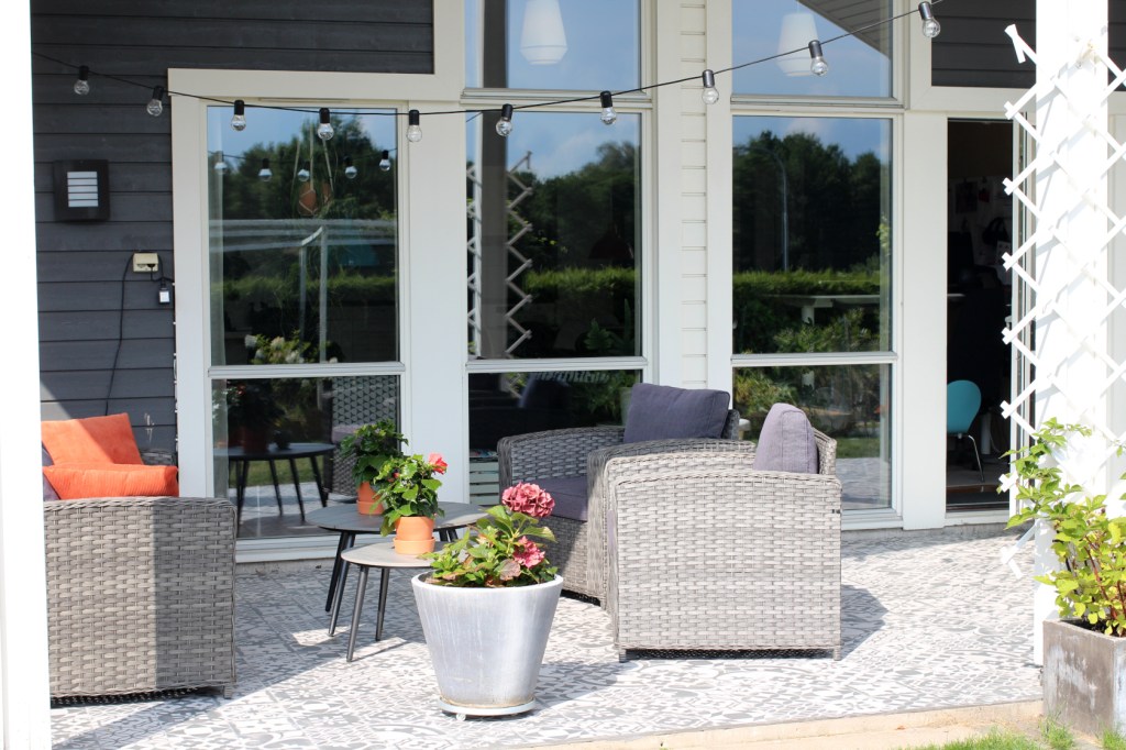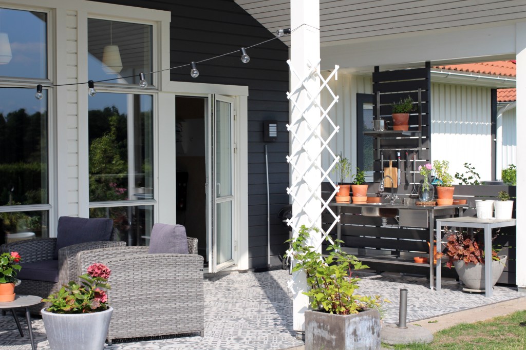 Kan inte låta bli, börjar med en liten teaser på uteköket. Här har ni en del av altanen, innanför ligger vårt vardagsrum och kök. Den klinkersförsedda delen av altanen ni ser är uppdelad i en loungeyta och en köksyta. Framför, vid pelaren, har jag en buske med björnbär. Loungeytan är egentligen inte så ny, förutom golvet då. Nya soffbord bara, och lite piff. Visst ja, nya kuddar och en lampslinga från IKEA ger pricken över i-et. Bakom soffan här skulle vi vilja ha skjutdörrar i glas, bara för att kunna skärma av mot kalla vindar om det behövs och förlänga kvällarna lite. Vi har ju ett uterum, så här är vi mest tänkt vindskydd.