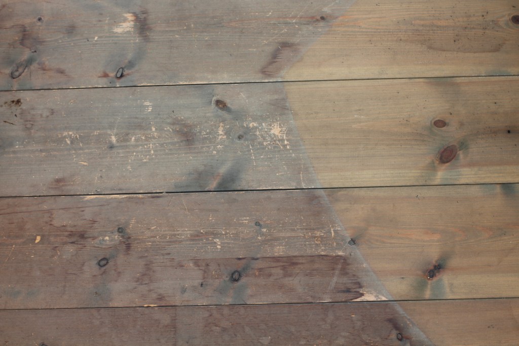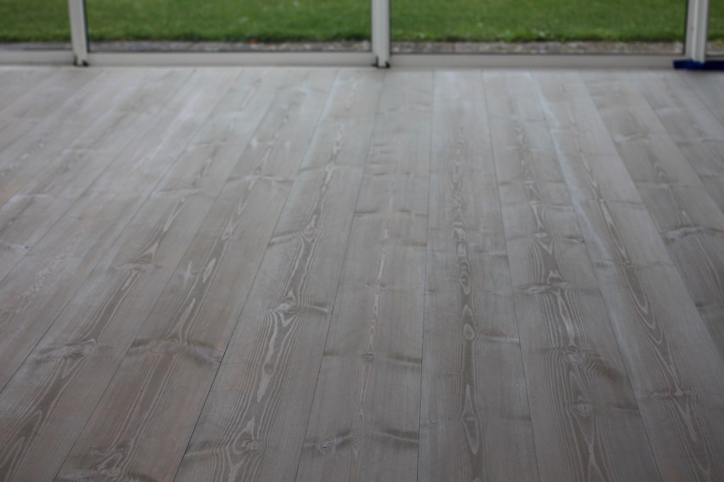 Det är ju inte mindre än 9 år sedan vi byggde uterummet nu, och även om golvet har klarat sig makalöst väl med bara ett tunt lager terass-lasyr så var det ändå dags att ge det en uppfräschning. Det har nämligen bildats något som ser ut lite som vattenskador men som är typ brännskador från när solen gassar som hårdast, och det har blivit allmänt slitet. Så här såg det ut innan: