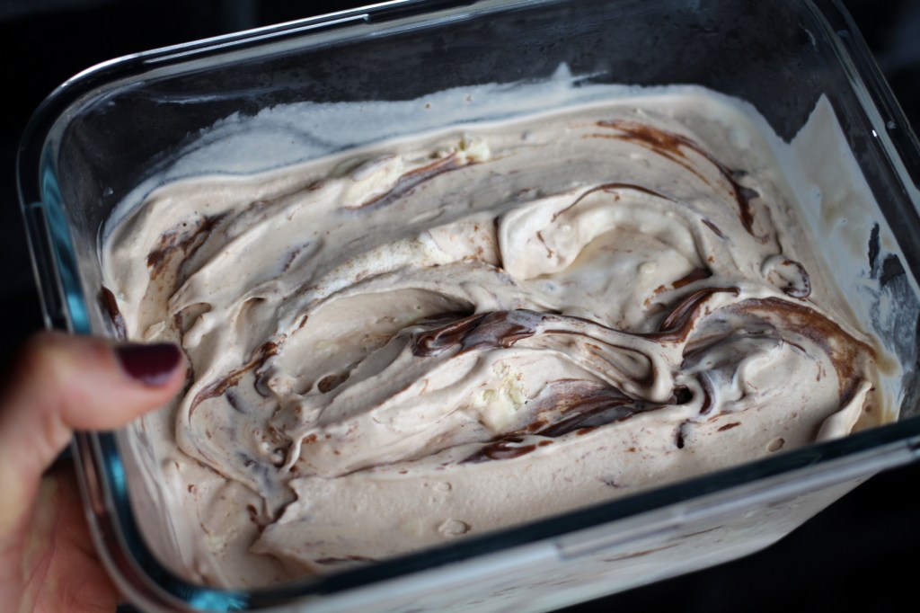 Vispa grädden ganska fast, vispa ner grekisk yoghurt och kondenserad mjölk och vispa lite så det tjocknar lite. Smaka av så sötman passar dig. Kör ner smeten i en glassmaskin eller frys in den direkt. När den är tillräckligt fryst (halvfryst om du inte använder glassmaskin) klickar du ner nutella och rör om lite slarvigt. Färdigt (om du nu inte kör utan glassmaskin, då behöver du frysa en stund till).
