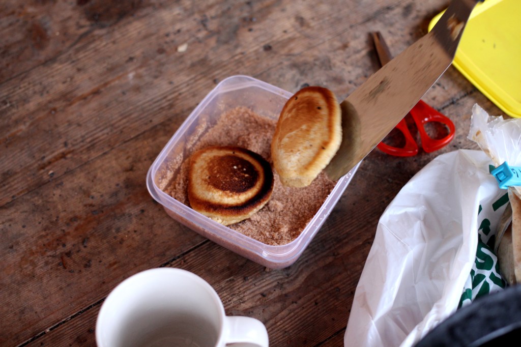Krabbelurer är en av de första sakerna som dyker upp när man googlar på recept över öppen eld. Jag har medvetet undvikit dem eftersom jag misstänkt att det skulle vara det enda barnen skulle fråga efter, eftersom de är mer som fika än lunch. Det är egentligen ett mellanting mellan amerikanska pannkakor, munkar och sockerkaka och jag kan meddela att det var sjukt smarrigt! Har dock talat om för barnen att det inte blir krabbelurer varje gång vi är ute i skogen, de är tämligen sockerstinna. Till det blev det äkta kokkaffe, vilken fröjd! Ska aldrig mer ta med kaffe i termos när vi ska ut i skogen…