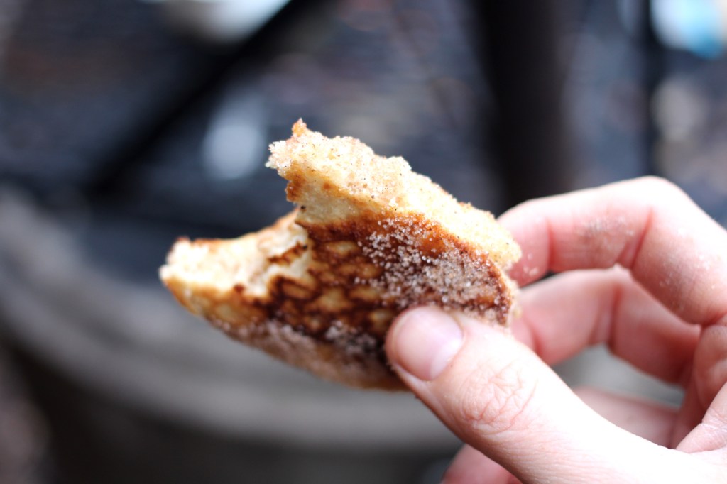 Värm en stekpanna över eld, häll i olja eller smör och dutta i små ”plättar” av smeten. Vänd när de är gyllenbruna, och när de är klara vänder du dem i kanelsockret. Supergott!
