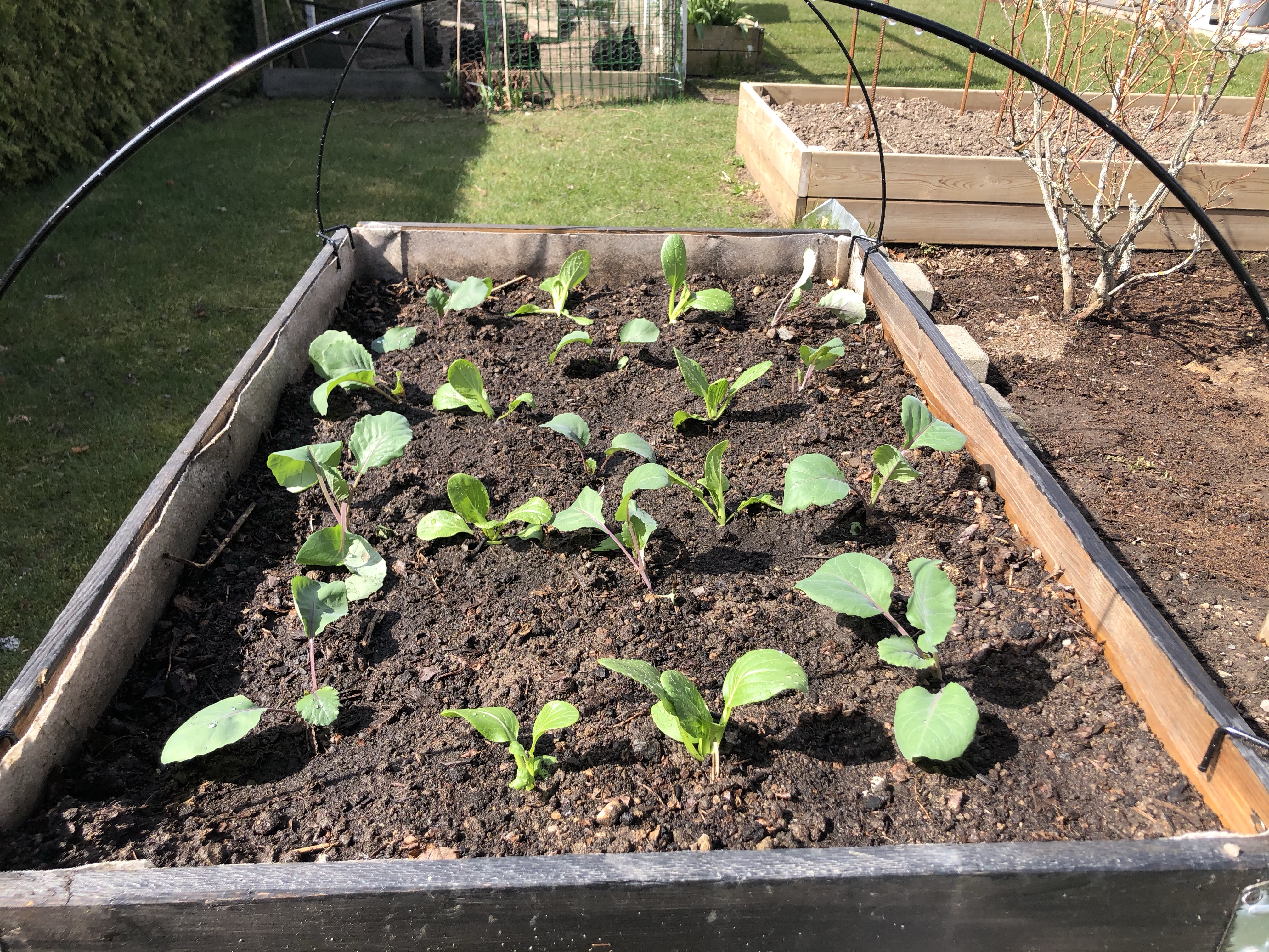 Kålnät kommer det vara över hela tiden, men nu i början har jag även fiberduk över för att skydda mot sol och kyla.