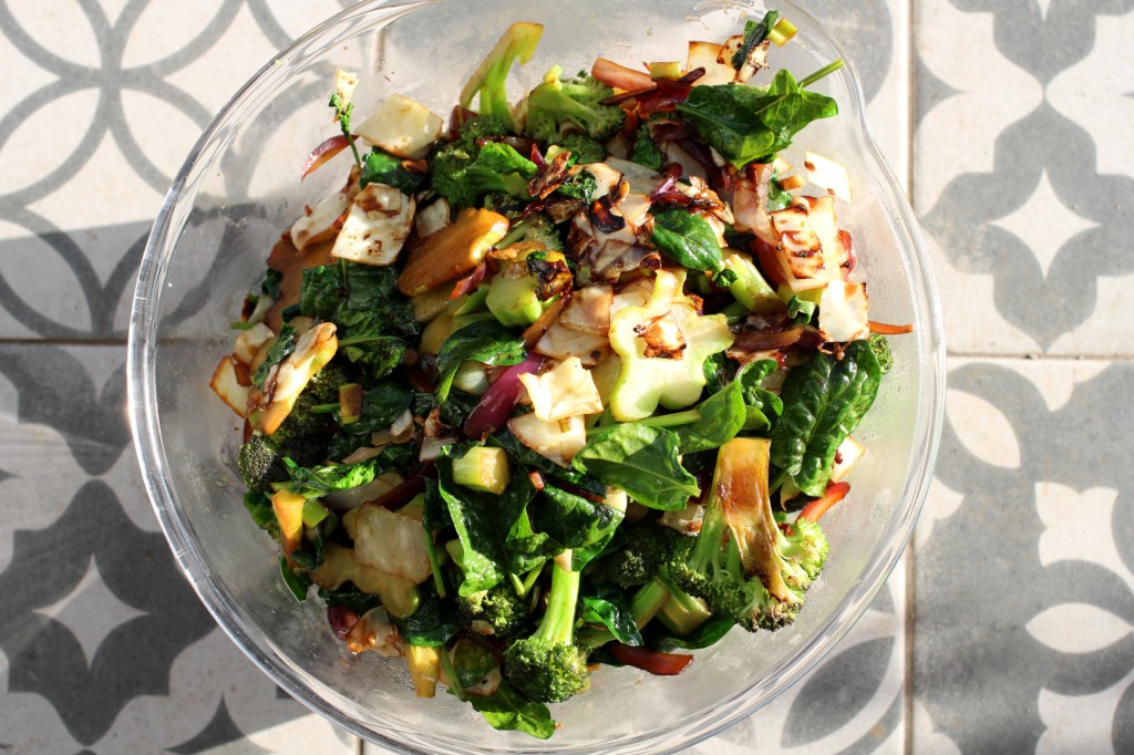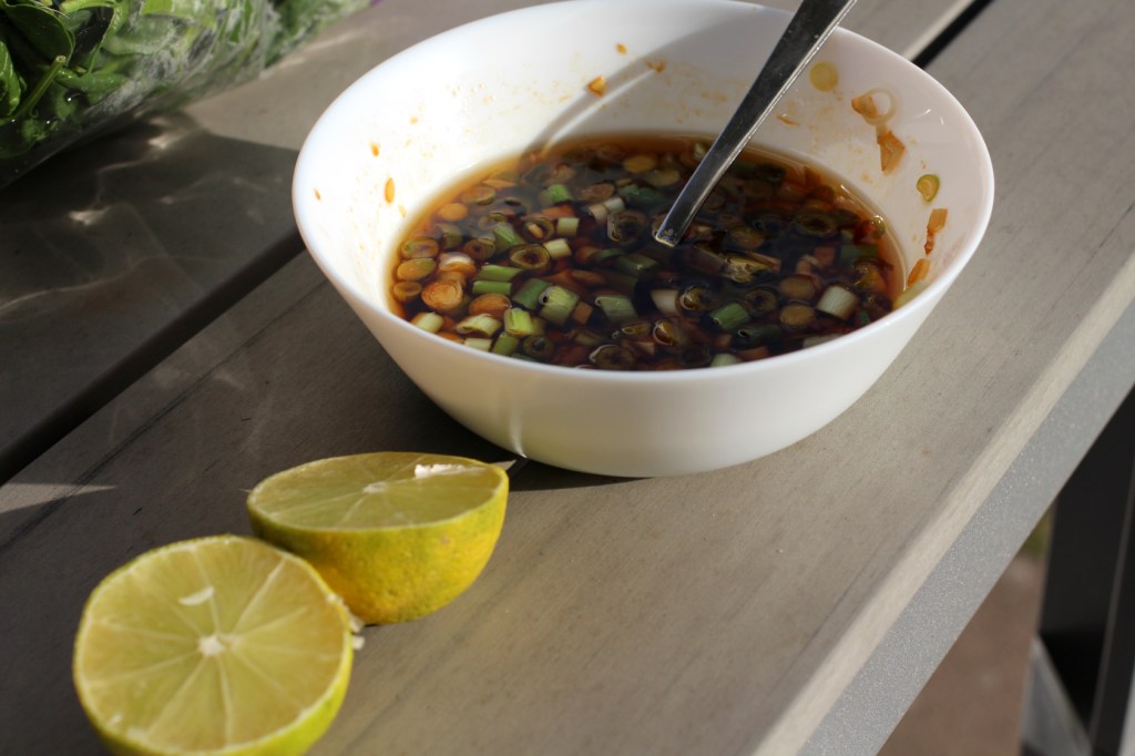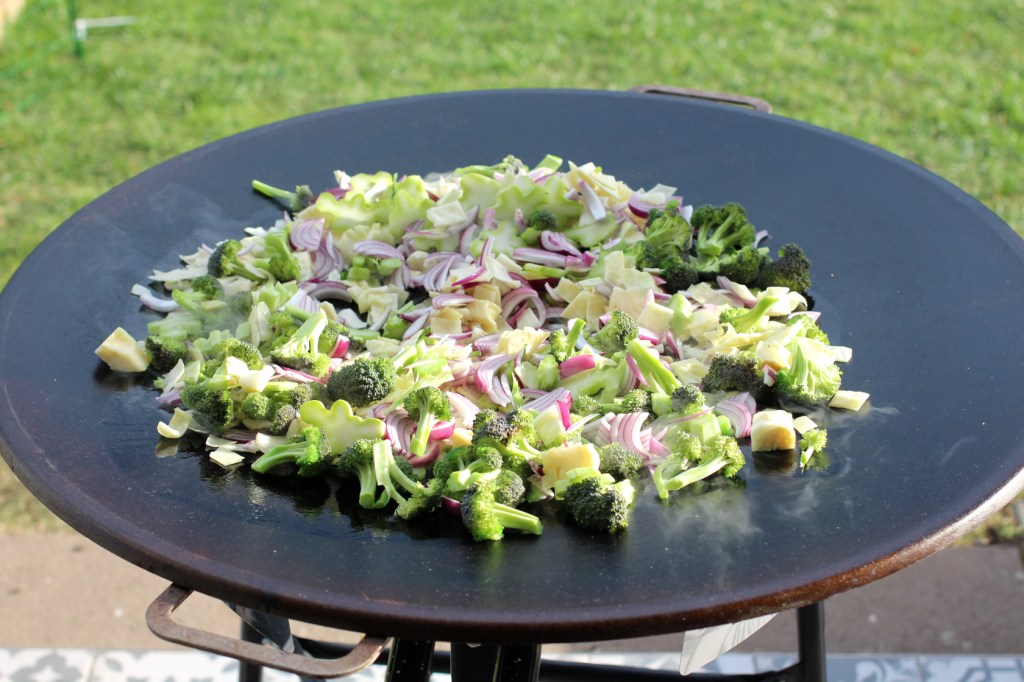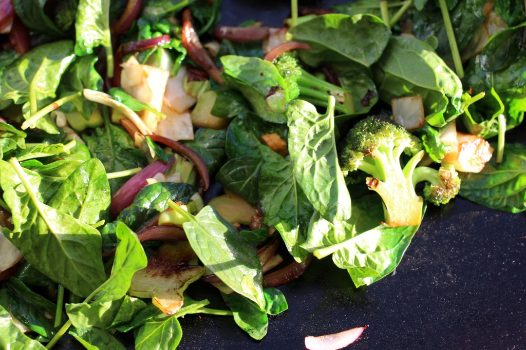När allt är förberett och ställt vid grillen (glöm inte något att lägga upp maten på), så häller du i ca 0,5 dl matolja i muurikkan och låter grönsakerna förutom spenat fräsa utan marinad tills de mjuknat något och fått fin färg. Medelvärme skulle jag säga är bäst, för du vill inte ha helt rå broccoli men du vill heller inte ha färglösa grönsaker. När det känns lagom mjuka häller du över marinaden och blandar om hastigt, sedan stänger du av värmen och toppar med hela påsen bladspenat. Vänd ner den i ett par minuter, så den börjar mjukna men inte så att alla blad blir helt mosiga.
