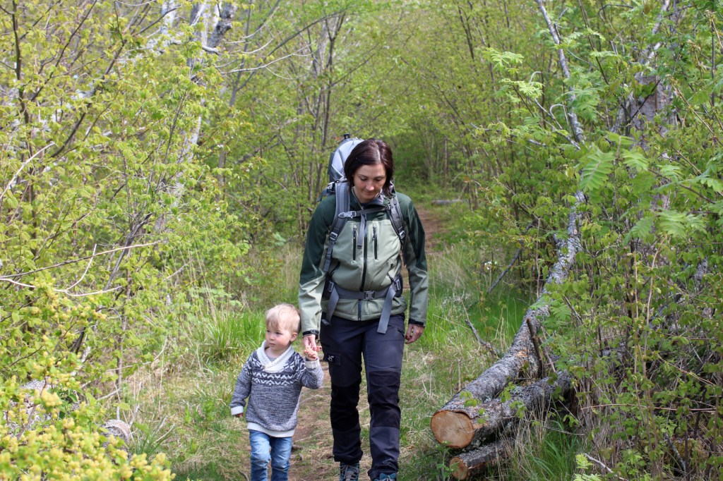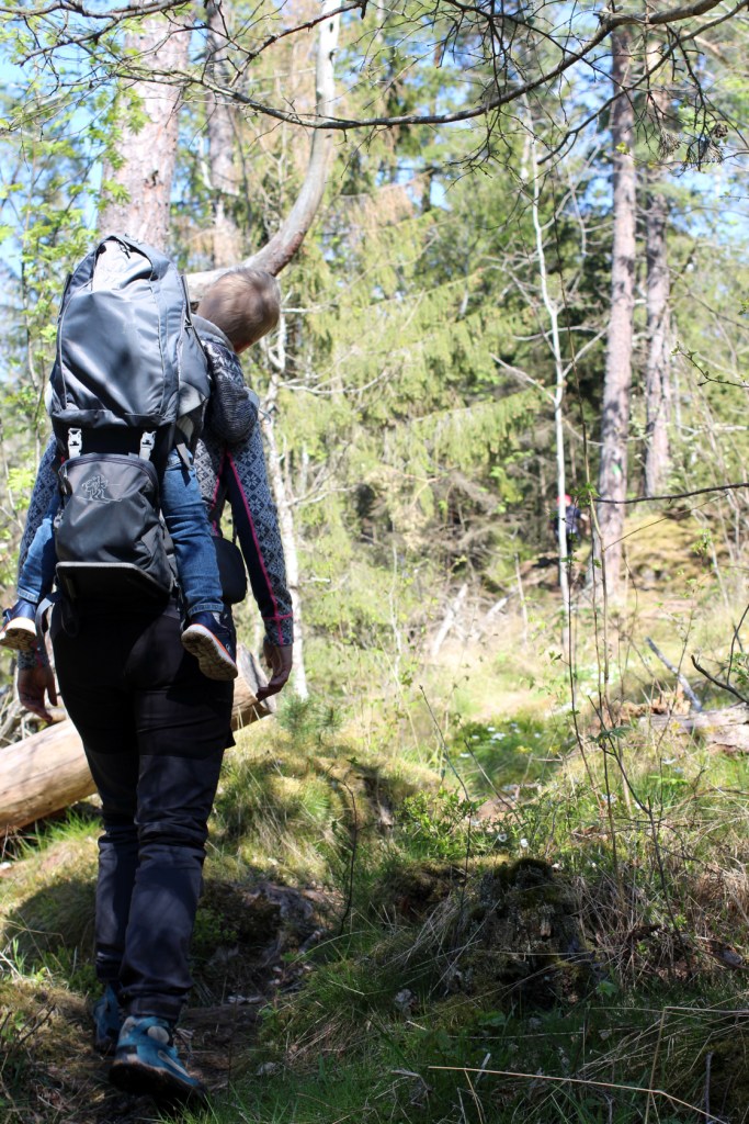 När vi gick hemåt så valde vi att ta den lite längre vägen en bit upp i skogen istället för att gå tillbaka utmed Vättern igen. Mycket roligare, men också mycket mer krävande och ibland nästan klättring. Det hade nog inte gått så bra att ta den vägen om inte Filip för en gångs skull glatt gick med på att sitta i bärryggsäcken, för det är SMALT och BRANT. Men som sagt, riktigt kul!
