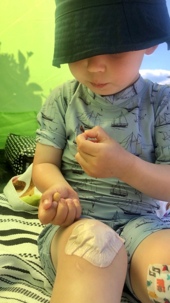 Just nu sitter vi i det lilla halv-tältet och vilar, jag och Filip. Han snubblade innan på stenarna och fick ett riktigt fult skrubbsår på knäet, det gjorde det INTE lättare att få honom att bada… Han är inte super-förtjust i vatten, men det ger sig nog.