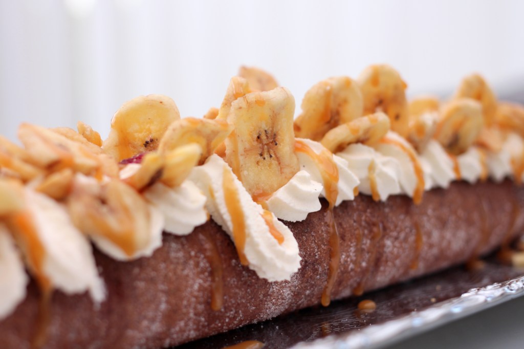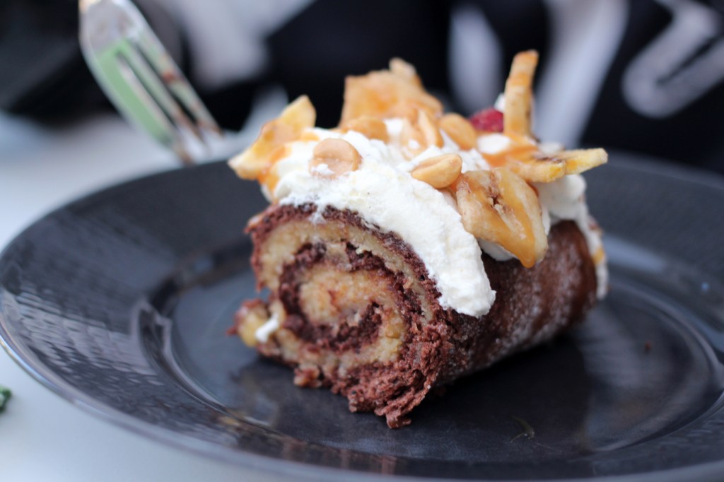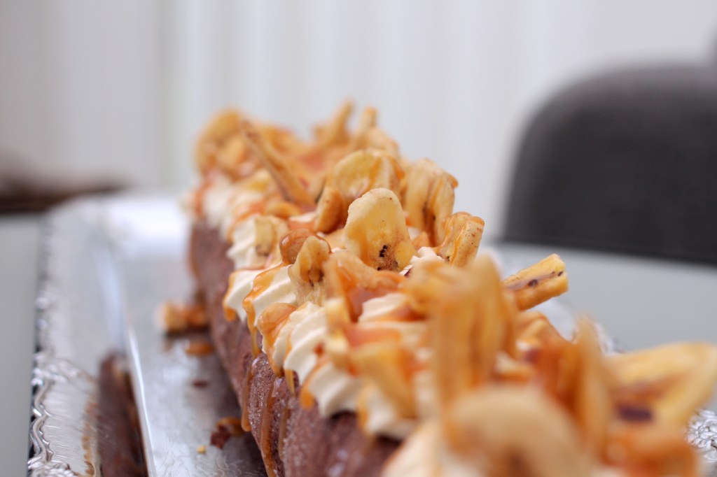 Chokladrulltårta med jordnötsfyllning, bananchips och salt kolasås