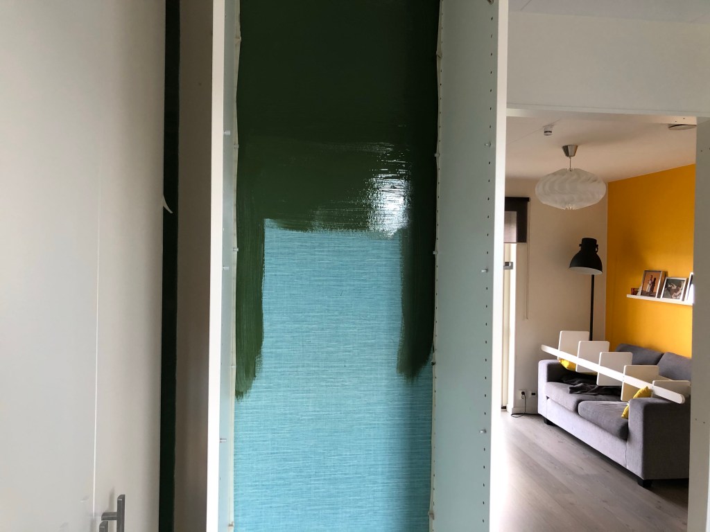 So far so god, vi började riva lister och jag började måla om insidan av vår skohylla i mörkgrönt – för där vill jag inte ha en tapet med vit botten eftersom det blir skitigt av skorna. Ungefär här…