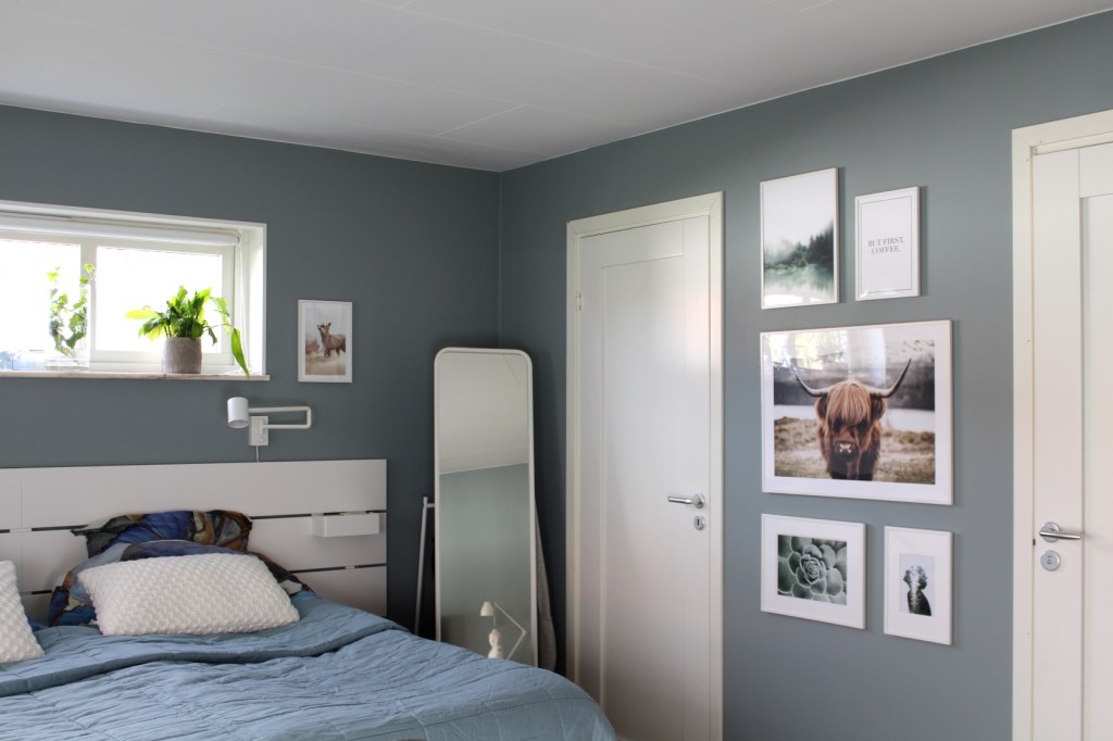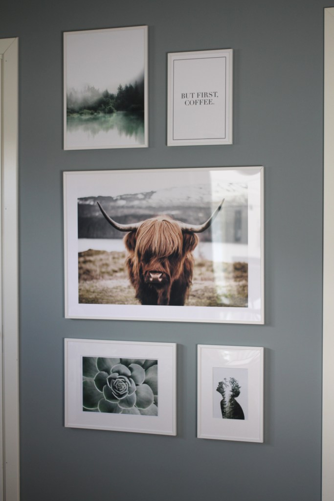 Förutom att vi har målat om så har det fått flytta in en byrå i fotändan av sängen, lite nya sänglampor och så mina fina tavlor med då. Utanför sovrummet är ju vårt uterum (fast man går ut genom köket), och där är det alltid ljust och fint. Sen älskar jag fönstret vi har över sängen med, det är ett grymt ljusinsläpp men hindrar ändå inte möbler! Det blev hela 11 tavlor, med affischer från posterstore.se och ramar från IKEA. Vi har inte en tavla i hela huset för övrigt, förutom lite i barnens rum, så det var riktigt kul att gå loss här! (Ej spons)Vi har ett stort sovrum, 18 kvm om jag inte minns fel, så det kändes bra att kunna flytta in ett litet skrivbord hit med. TV’n ska bytas ut, och sedan sättas upp på väggen, så sen har vi en plats man kan gå undan på om man har tex distans-möten eller när jag har skola. Mycket efterlängtat!Jag är löjligt nöjd över den här fotoväggen, fullkomligt älskar kon i mitten!