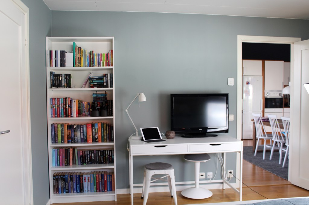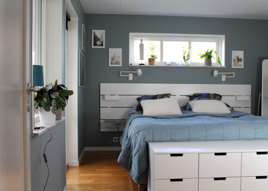 Det är svårt att fota i sovrummet, för det blir motljus nästan hur man än gör, men bilderna blev hyfsade ändå. Däremot är det lite mer färg i väggfärgen än bilderna ger sken av, på fotona ser väggen nästan grå ut, men det gör den inte i verkligheten.