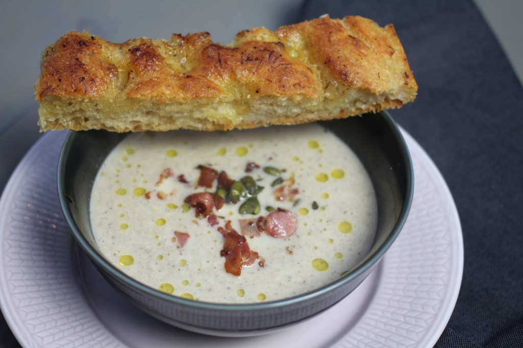 Kände inte för någon köttbaserad mat i dag, och var lite trött på svamprisotto, så då föll valet på svampsoppa. Sen hade jag ändå rätt gott om tid, så det fick bli min extra frasiga focaccia till, och det är ju ändå typ det godaste man kan äta till en soppa…