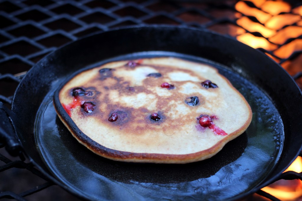 Blanda alla torra ingredienser, rör sedan ner mjölk och ägg till en slät smet. Rör ner blåbären om du har med dem hemifrån, annars gör du detta på plats vid elden. Häll upp smeten på någon form av flaska eller termos, jag brukar använda en tom ketchupflaska eller juiceflaska. Har man blåbär i måste man ju dock skruva bort hela korken när det ska ut, annars är det perfekt att trycka ut smeten.