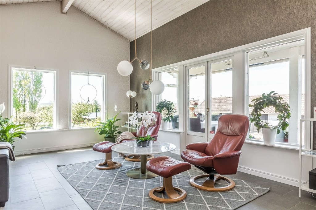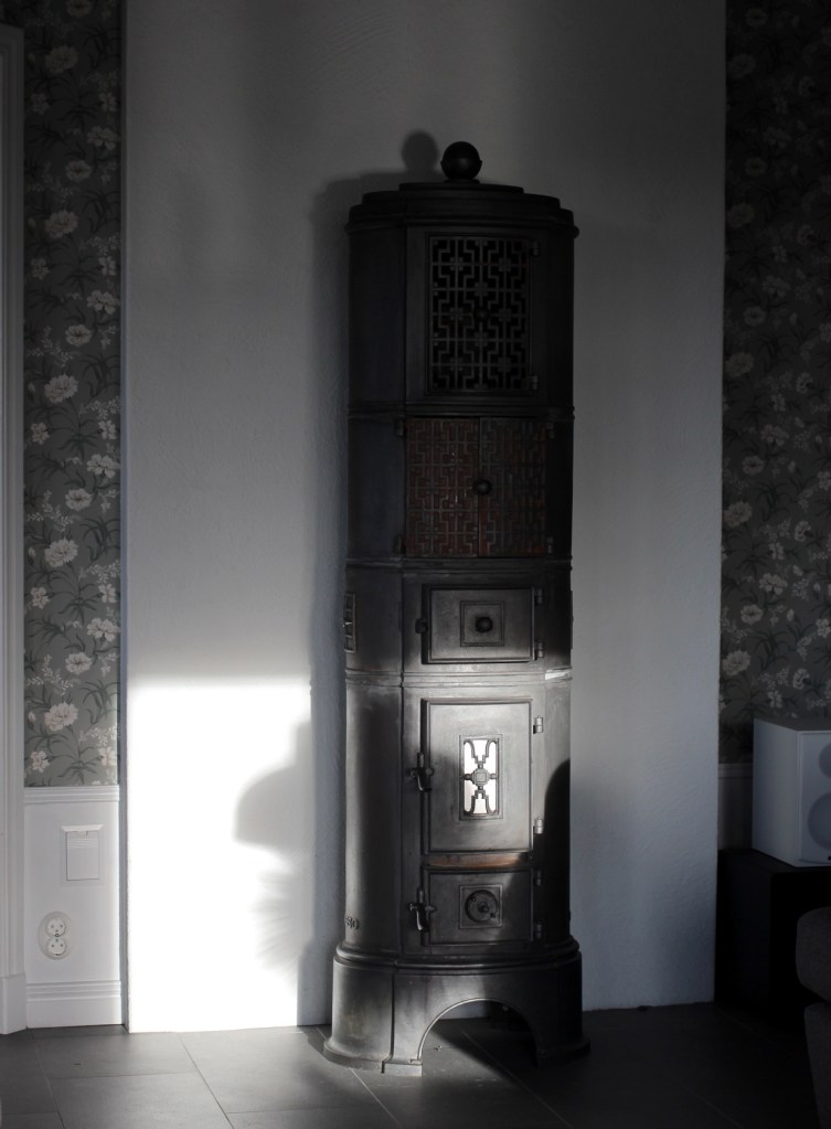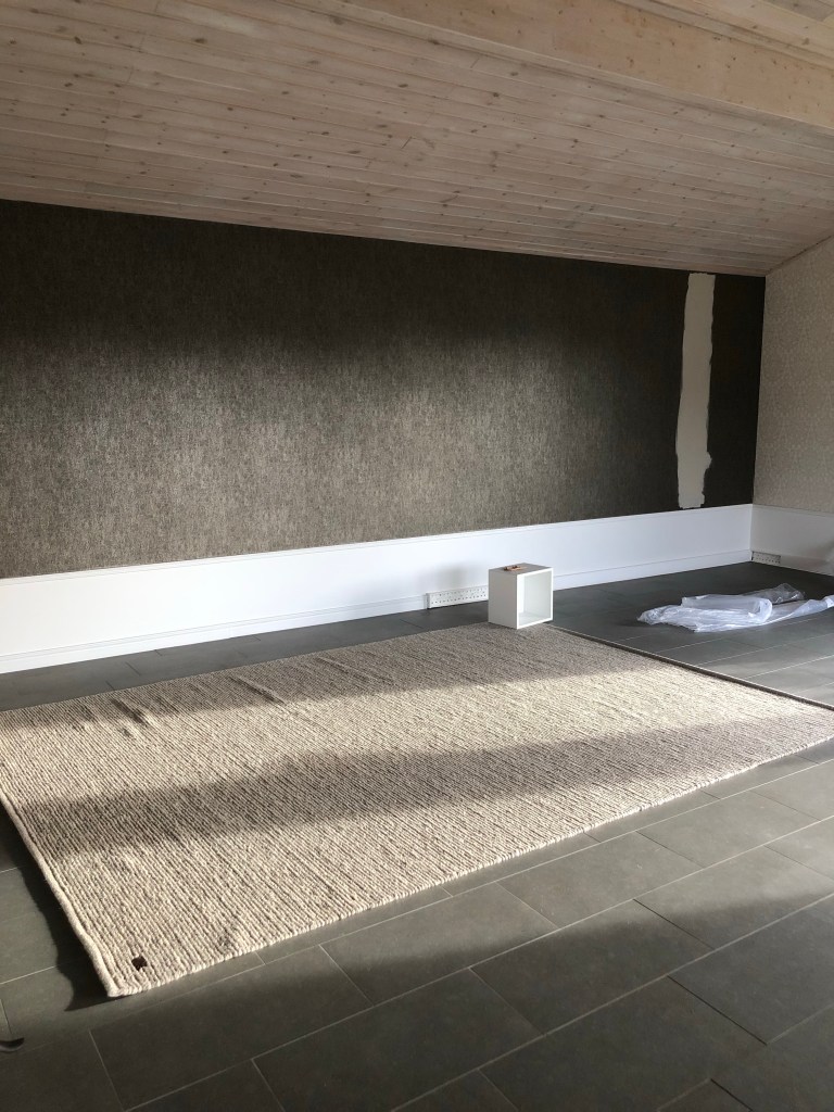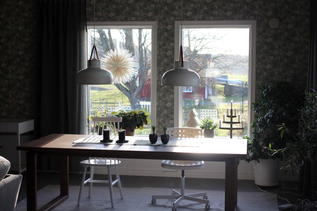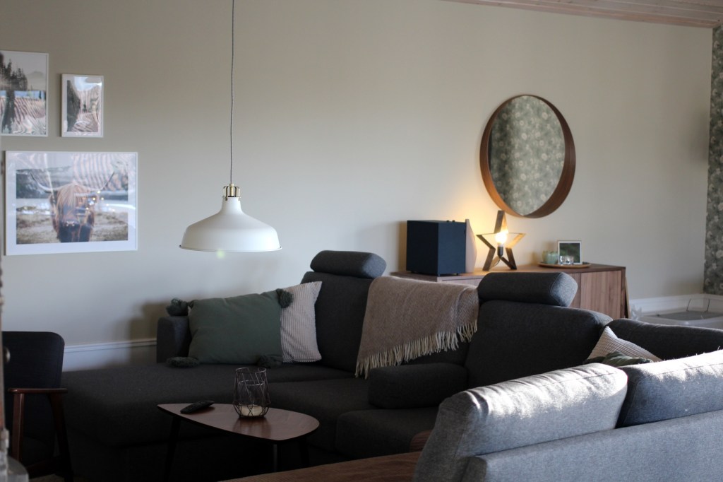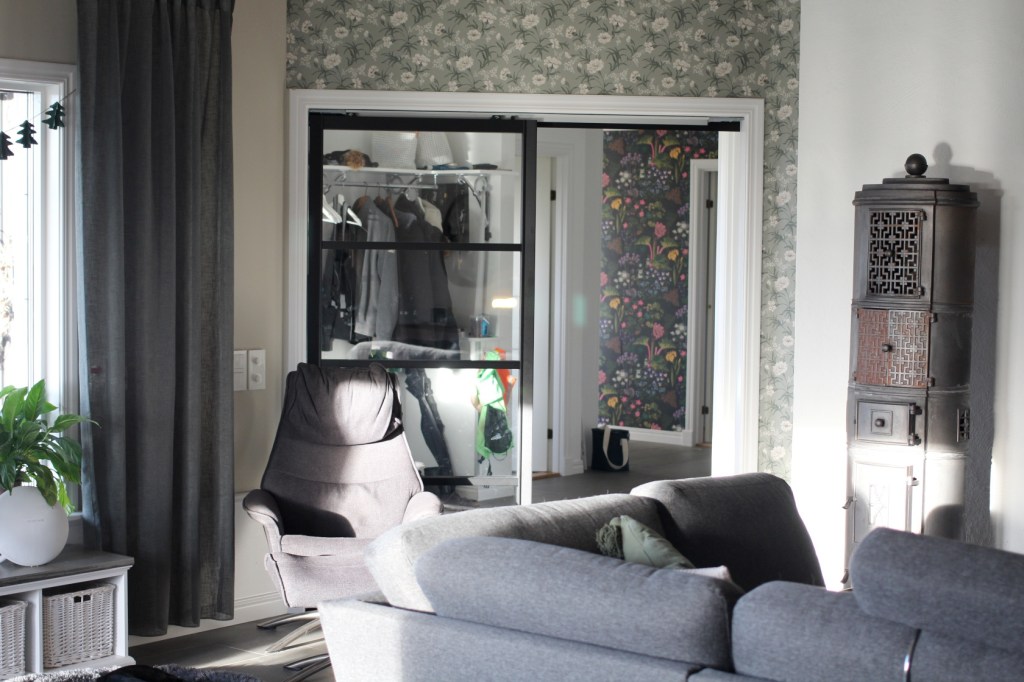 Före: Lite konstig möblering, känns som fåtöljerna till höger mest stod där för visningen. Det syns inte så väl här, men den bruna tapeten var otroligt mörk och ganska deppig. En bild från mobilen, precis när vi flyttade in (och höll på att provmåla). Här syns hur mörk tapeten var. Har inget emot mörka färger, men den där liksom sög upp allt ljus.Men kolla vad fint, vi har en liten bröstpanel eller hög golvlist eller vad man ska säga!Efter: Som sagt så orkade jag inte byta objektiv, så de här bilderna blir lite mer inzoomade. Långsidorna på väggarna har fått en ljust beige nyans, och möblerna här inne går i valnöt. Färger på kuddar mm är beige och mörkgrön. Soffhörnet har blivit väldigt ombonat och mysigt, det kändes som en bra placering av det ändå. Soffan sitter så man även har kaminen snett framför sig i den och en tavelvägg vid sidan av gör att inte väggen bara känns så lång och tom. Före: lite krystat, som sagt. Efter: Här valde vi i stället att sätta vårt matbord, så man får lite utsikt. Det är bara stolar hit som saknas, men det får bli en senare sak att lösa.Omöjligt att fota i motljus, men vi har i alla fall fin utsikt här 🙂Före. Här syns hallen ut till vänster. Efter. Lite mer ombonat med gardiner, tycker jag. För övrigt, den här kaminen alltså, den är otroligt vacker! (Och fungerande)