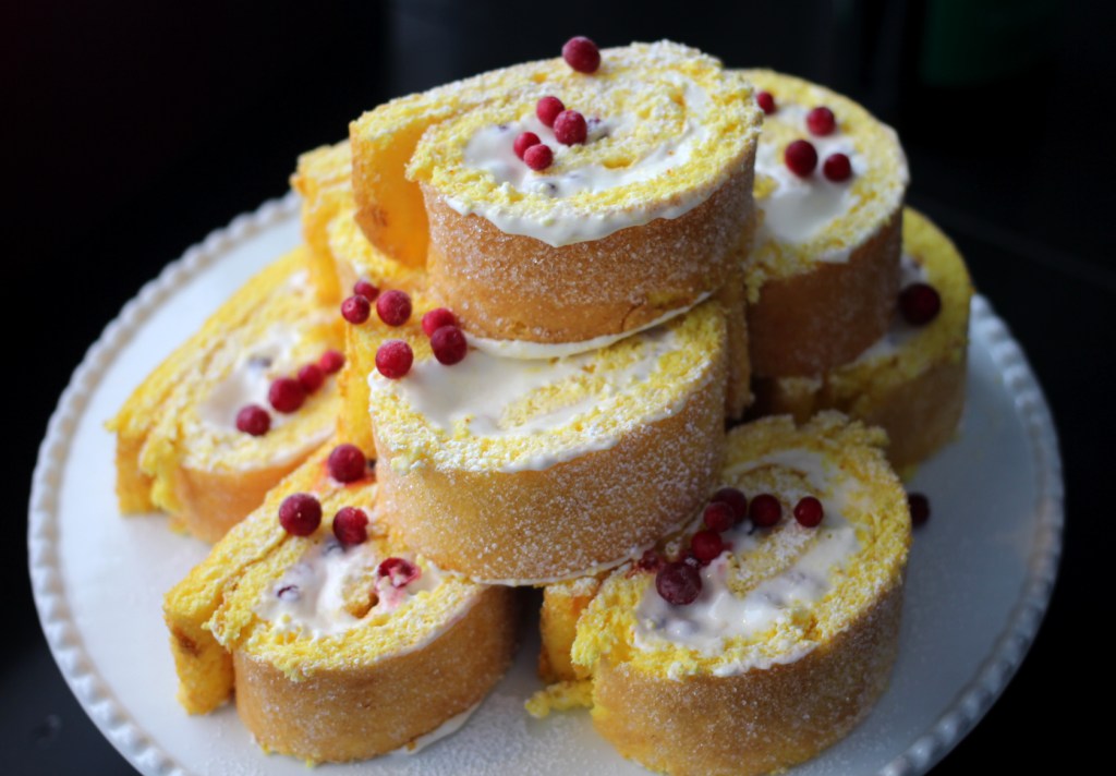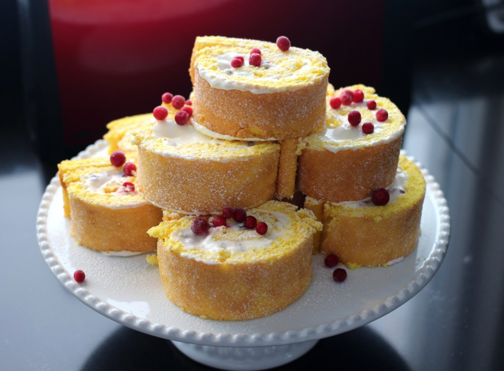 Bred ut fluffet på nästan hela rulltårtan, och rulla sedan ihop den – ganska ”hårt”, annars blir den väldigt platt. Se till att skarven hamnar nedåt på fatet.