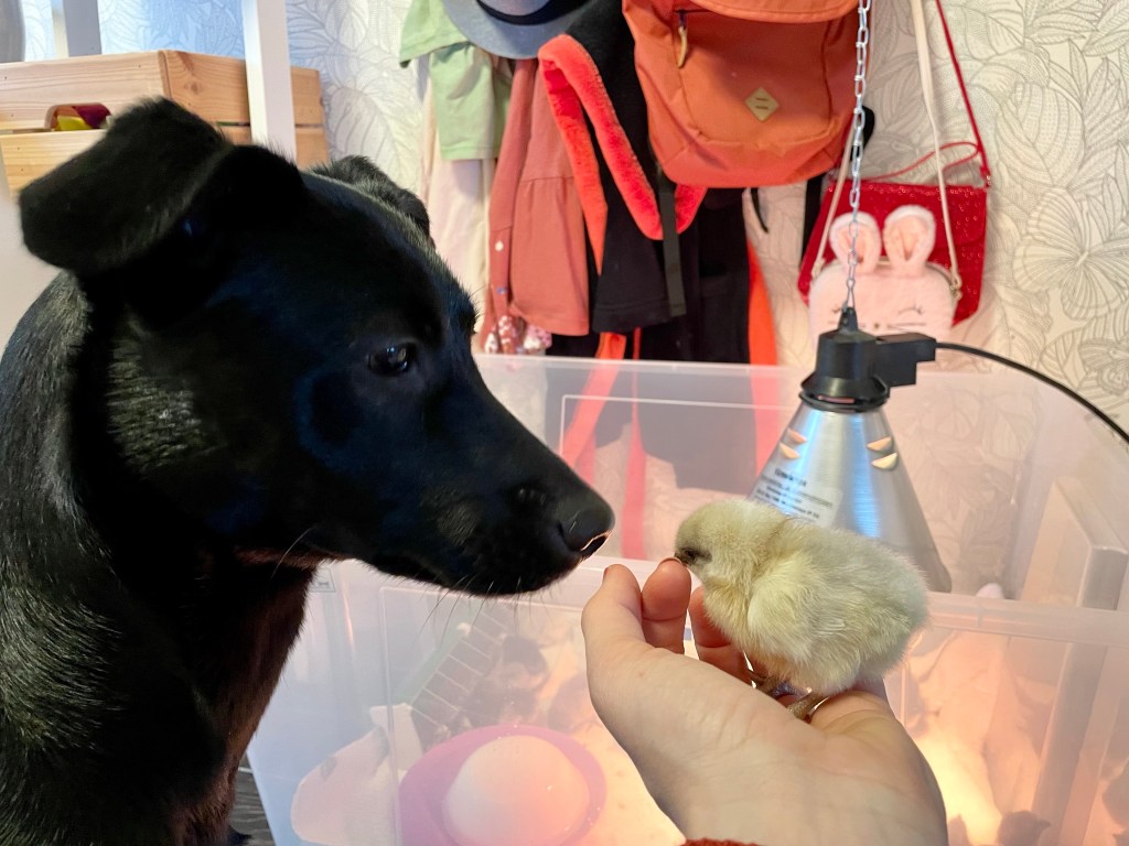 Nala är mycket konfunderad här hemma, jag kan inte bedöma om hon tror att det är en massa små pipande valpar, pipleksaker eller nåt att äta. Hon får nosa på dem så mycket hon vill när jag håller dem skyddade i handen, min förhoppning är att både hund och kycklingar ska vänja sig vid varandra, det skulle verkligen underlätta. Jag stänger givetvis så hon inte kommer åt dem själv. Nala är i alla fall väldigt orolig här hemma, går runt och piper och vill helst ligga och kolla på kycklingarna hela tiden, men det lugnar sig kanske om ett tag. Har nån bra tips på att få hund att ta hand om kycklingar så säg till!