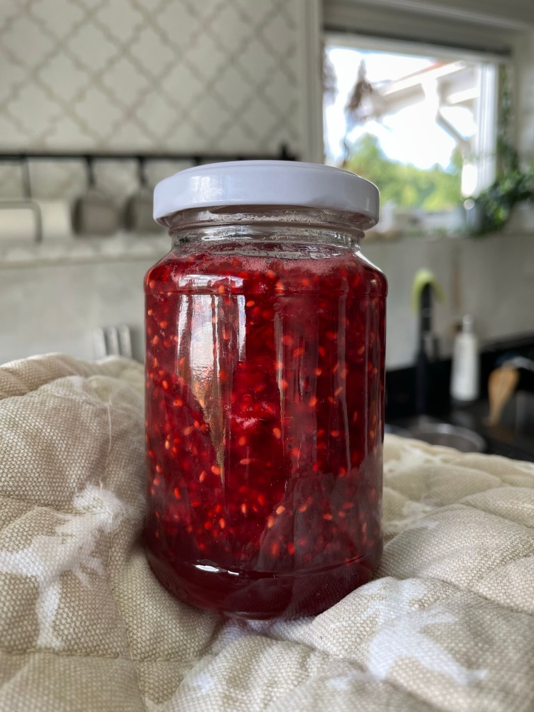 Lite mer hallonsylt lyckades jag skrapa ihop det till under förmiddagen i lördags, det blir inte så mycket som jag hoppades på buskarna, men så skar jag ner dem rätt hårt med. Blir nog bättre nästa år!