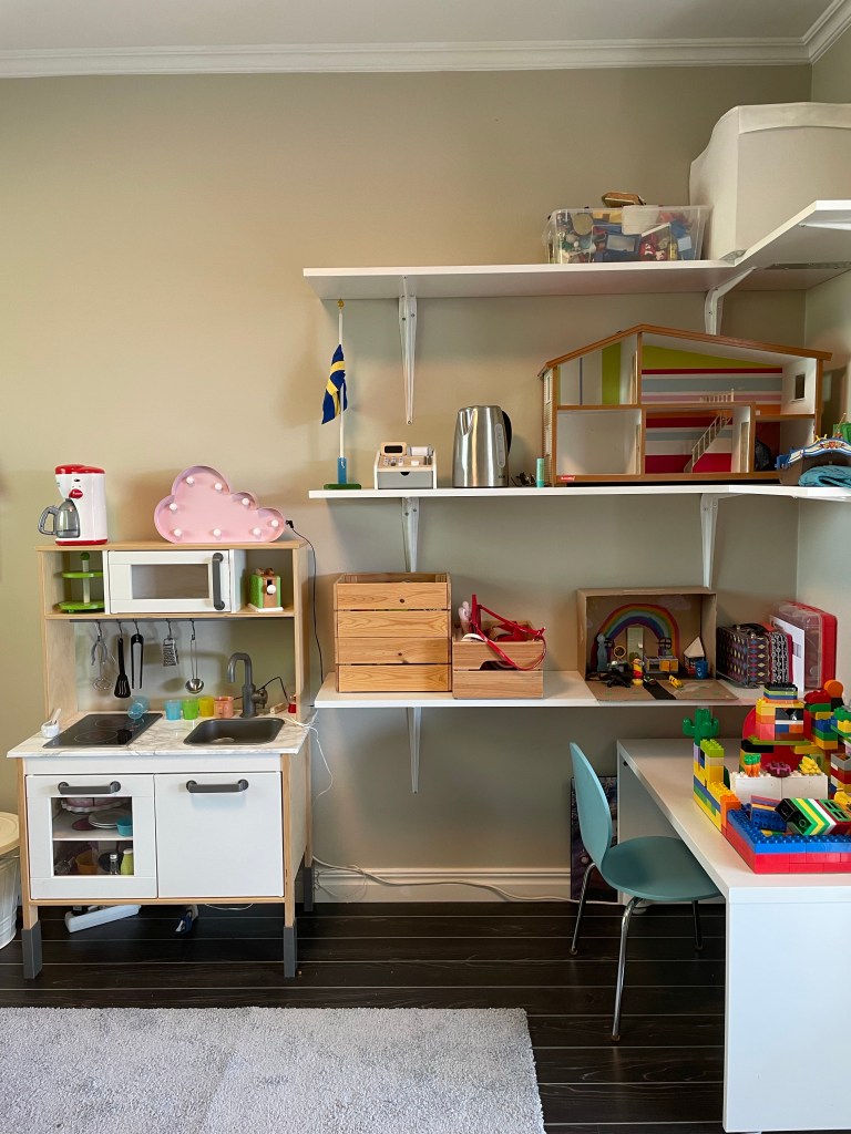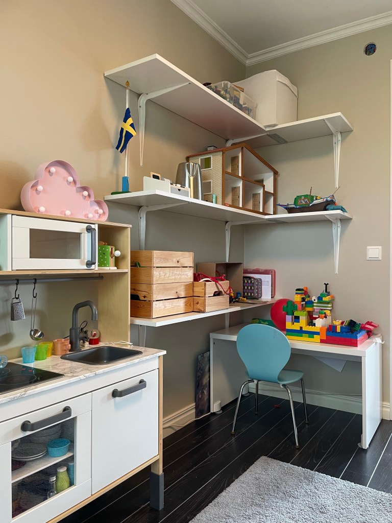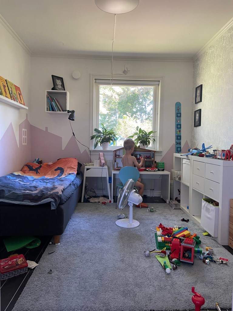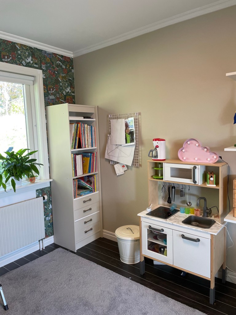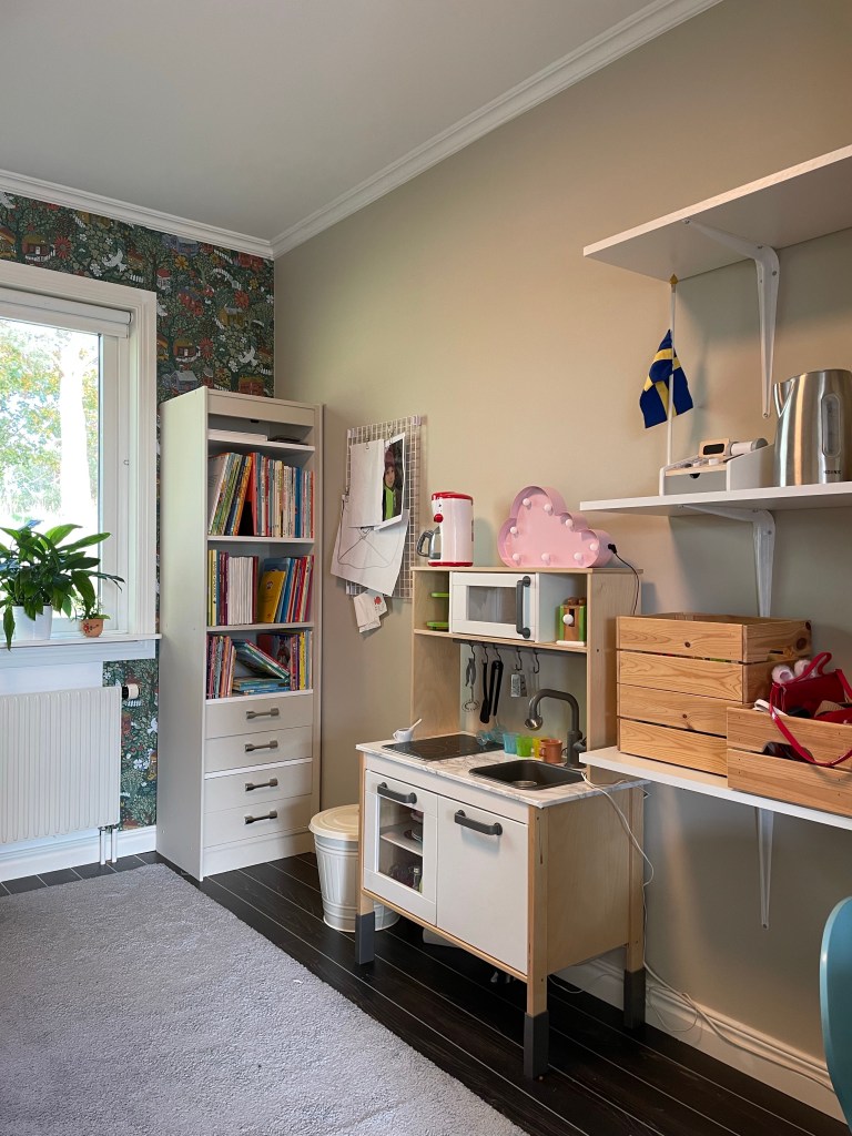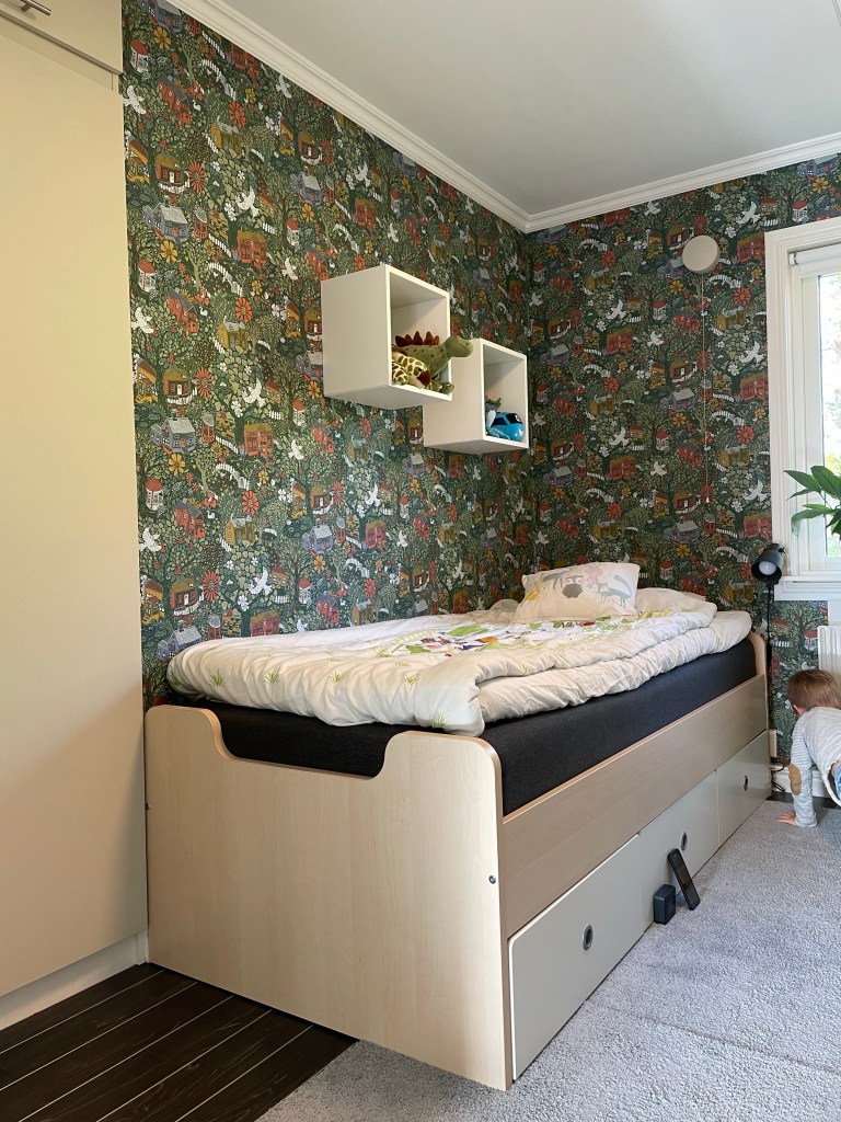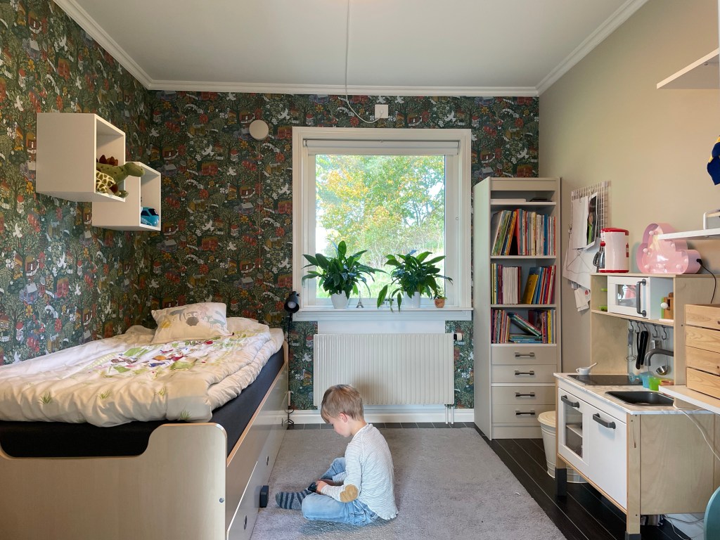 Så, vi är ju sällan långsamma när vi vill göra något, nu har vi gjort om hela hans rum förutom golvet. Det blev väggfasta hyllor – det enda som saknas där är lite bra trälådor att ha leksaker i – en egen bokhylla och så sängen med lådor. Han och jag är SÅ himla nöjda! Maken är lite tveksam till tapeten, hahaha… Nu känns rummet mer funktionellt – och när han tröttnar på sitt lilla kök kan man ställa dit ett skrivbord i stället. Bra med egen bokhylla med för han ÄLSKAR verkligen böcker!