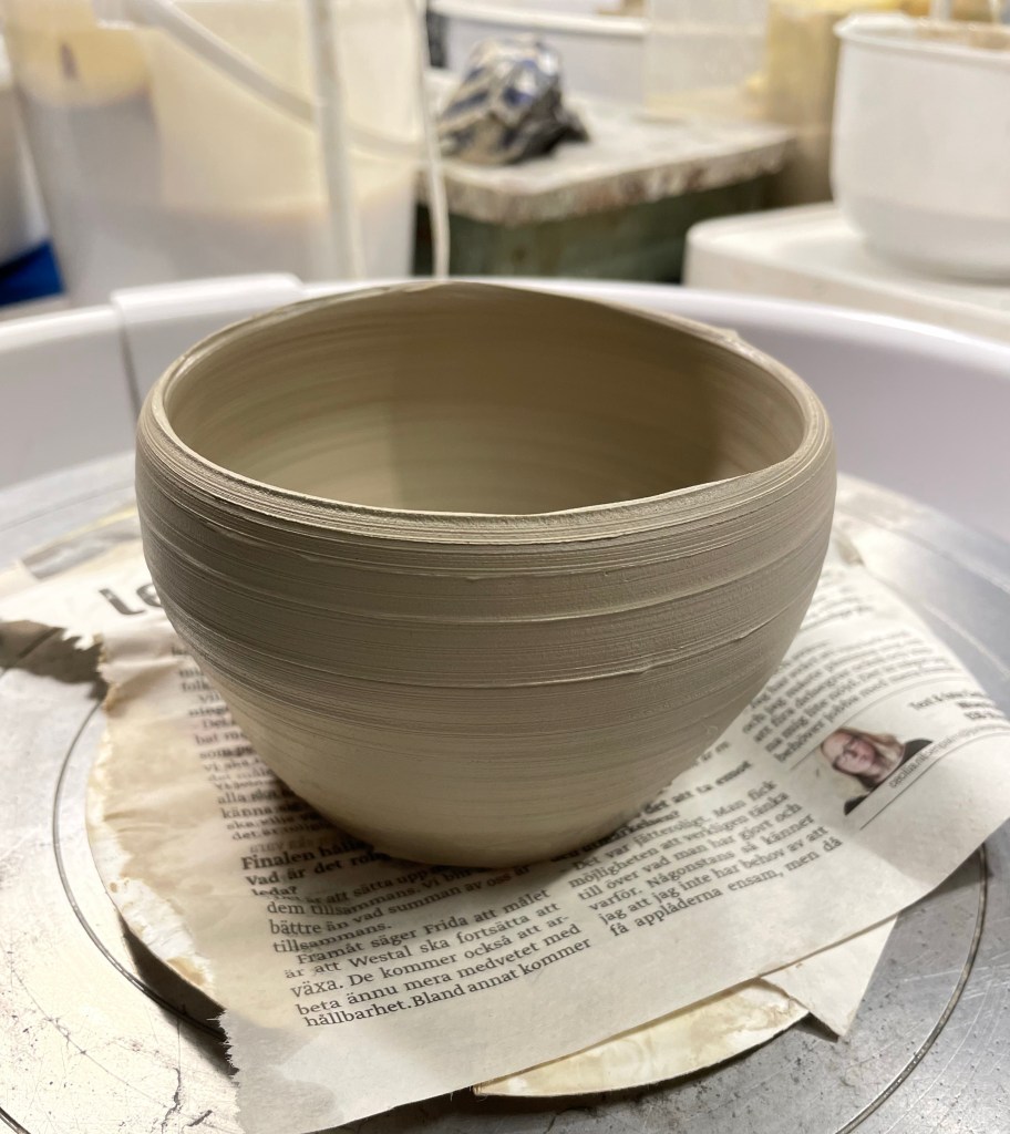 Vi fick två ”lerklumpar” på sammanlagt ett kilo att jobba med, och en av sakerna vi gjorde kommer bli bränd och glaserad och klar ”på riktigt”, den andra fick vi ta hem och lufttorka om vi ville. Däremot fick vi ju göra om klumparna så många gånger vi ville, och det var ju som sagt hur kul som helst att dreja så jag tror jag hann göra 5-6 varianter på skålar under tiden vi var där. SÅ skönt att sitta och bara meditativt göra något med händerna, låta dem göra hela jobbet och bara vila den tänkande delen av hjärnan. Hade det inte varit typ svindyrt så hade jag gärna haft grejor hemma för att dreja lite, men ärligt talat är det liksom inte motiverat att skaffa alla prylar och så som behövs för att det ska bli nåt. Nåväl, kul att prova på i alla fall, jag blev dessutom nöjd över mitt resultat och har likt ett stolt barn visat upp det för alla som vill (och inte vill) se!