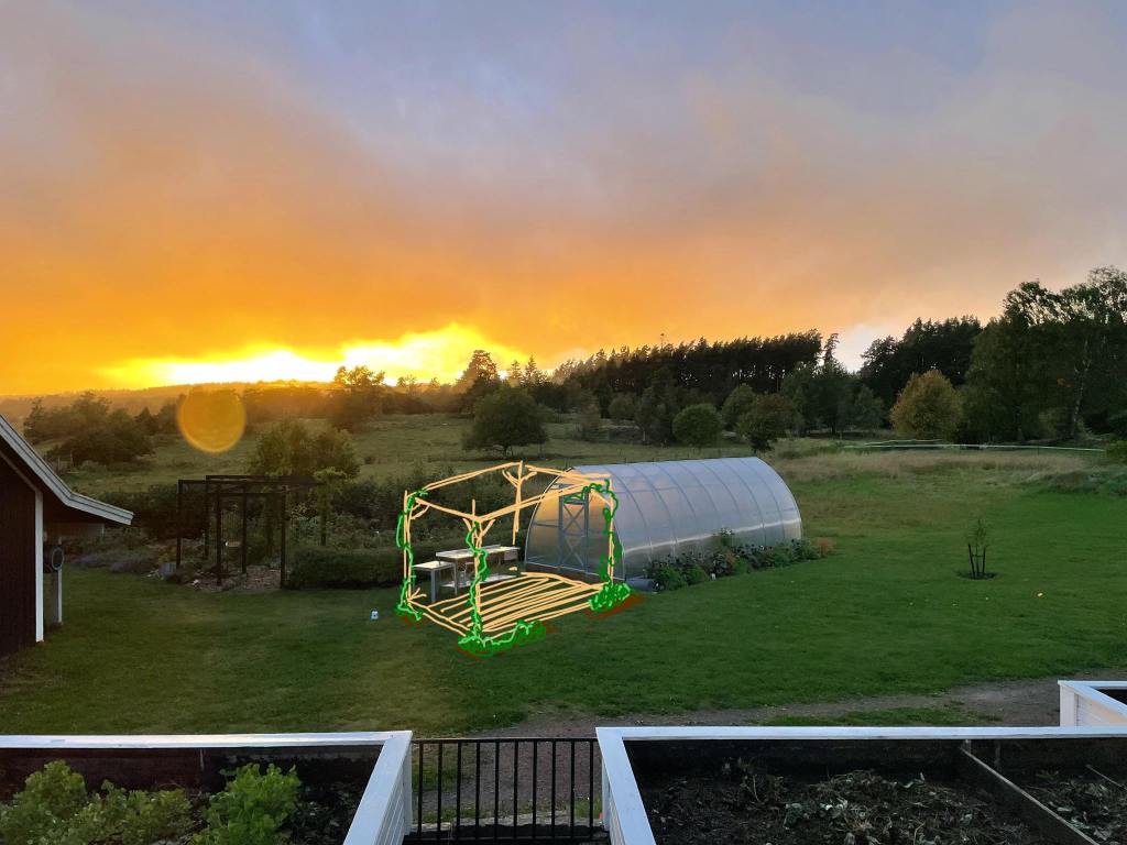 Utmed långsidan av växthuset har vi planterat en massa amerikanska blåbär av olika slag, och framför växthuset på gräset står idag den köksbänken som skymtar på bilden ovan. Här skulle vi vilja bygga ett litet trädäck med pergolafunktion, dels för att få en gnutta skugga i växthuset under sommaren men framförallt för att få en bra och mysig arbetsyta. Den skulle jag vilja kanta med land där vi kan odla klätterväxter och lite annat – kanske rosor? Den låååååångsiktiga planen med den platta gräsytan kring växthuset är att den ska få bli riktigt, riktigt lummig. Skulle även vilja plantera pil här och fläta ihop till ett grönt ”tält”, både för barnens skull men även för att det skulle ge en bra plats för hönorna att söka skydd i från sol och rovfåglar om det behövs. Vi har dragit fram vatten till köksbänken redan nu, vilket är oerhört praktiskt!