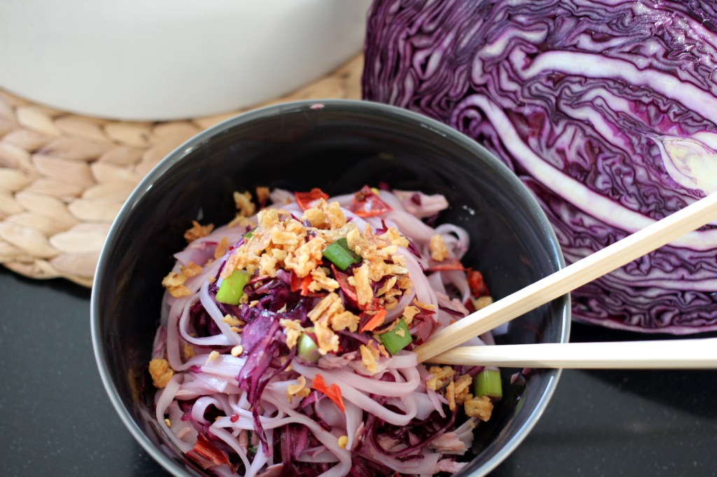 Strimla kålen fint – jag använder mandolin men osthyvel eller kniv funkar också. Ringla över olivoljan och 1 msk limejuice och massera ihop kålen så den blir lite mjukare (använd gärna en handske om du har rödkål, det färgar av sig!). Häll av oljan eller vattnet från tonfisken och lägg i skålen, strimla salladslök och lägg i med. Koka risnudlarna i lättsaltat vatten i ca 3 minuter, häll av och lägg i salladen. Blanda ihop marinaden med fisksås, limejuice (resterande 2 msk), sojasås, socker och ev. sesamolja och häll över salladen. Blanda runt salladen – klart att servera med den topping du väljer. Vi lägger till topping på varje portion för att alla tycker lite olika! Jordnötter är kanon, men de hade visst *nån* ätit upp, så i dag blev det rostad lök och chili istället. Gott det med!