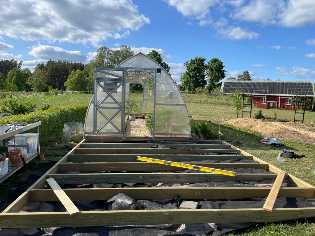 Förutom lite blommor och planteringar så har vi hunnit få upp ramen till altanen vid växthuset. Det ser kanske ut som om den borde varit centrerad, men det kommer klarna när vi blir klara varför vi valt att göra den så här. Det här kommer också bli fantastiskt bra!!! Tror vi kommer hinna göra klart trallen nästa helg, och sen får vi se när det blir pergola.