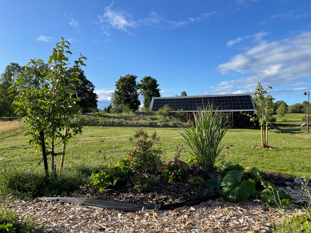 Till höger här nedan ser ni vårt allra nyaste äppelträd Folke – ett spontanköp från Backamo. Vi har planer för att hela ytan här bakom ska bli en frodig och blommande plats, men det kommer ta en massa år. Nästa år försöker vi kanske få till en rosenrabatt här någonstans.