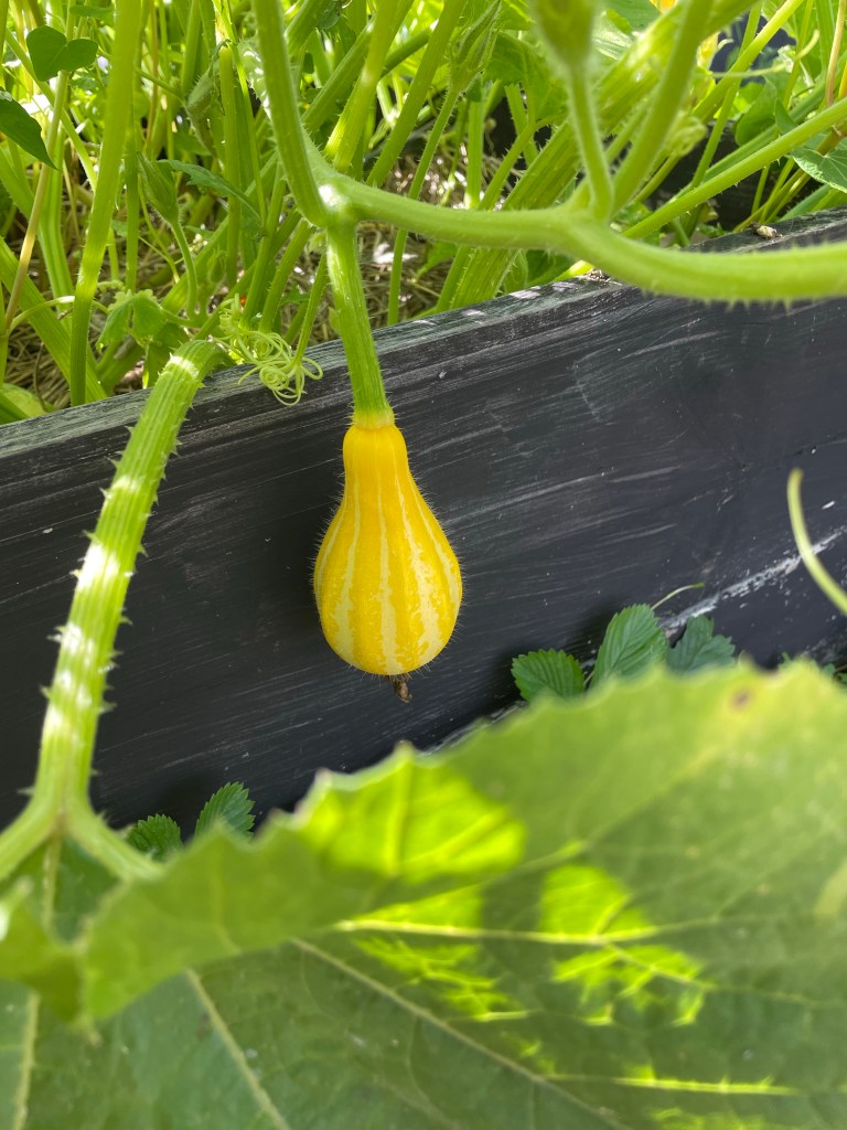 Ungefär hälften av sakerna vi odlat i år har gått bra, resten har varit riktigt dåligt. Dill har gått uselt, liksom ärtor, bönor, sallad och vitlök. Tomaterna går lite sisådär – det är ganska fina plantor men relativt få tomater. Gurkan har ÄNTLIGEN kommit igång och vi har massor! Nåt som äntligen också har tagit sig så är det pumpaplantor, men jag är mycket skeptisk till att de ska hinna ge någon vettig frukt. De som växer bäst är de halvruttna kärnor Filip hittade av en komposterad prydnadspumpa som han själv petade ner i lite krukor (jag var HELT säker på att de var ruttna så jag kollade inte ens vad han gjorde), de har kommit MÄNGDER på nu och är jättefina, om än små.