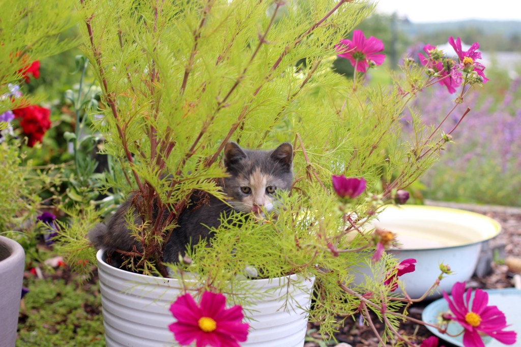 Vi har ju fått tillskott av tre djurslag här på gården under sommaren, först en enda kyckling (ok, kom lite innan semestern men ändå), Gullefjun. Sen flyttade äntligen grannens katt upp sina kattungar hit till oss så vi kunde börja gosa lite mer med dem – de är så söta att jag till och med förlåter dem för att de totalt demolerat alla blommor i mina krukor på altanen när de leker i dem! Sist ut så hämtade vi ju en ankmamma med 5 ällingar till vår damm – har dock en gnagande oro att majoriteten är hanar, vilket skulle bli alldeles för mycket hanar för en enda hona om så är fallet. Vi höll på att spontanköpa 3 Lappgetter med, som komplement till de fyra får vi ju lånar över sommaren och som inte hinner beta av allt riktigt, men vi fick inse att vi inte kommer kunna försörja dem med mat nog i vinter dessvärre. Trist men nödvändigt beslut.