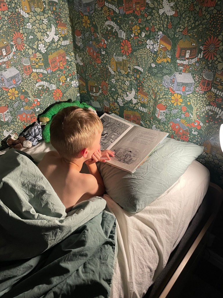 Filip har ju börjat fritids och har nu gått där en vecka. Det har gått riktigt bra och det har inte varit några problem att få dit honom eller lämna honom – kanske lite för att TV’n stått på när vi kommer med 😉 Nästan inga av hans dagis-kompisar gick förra veckan däremot, men det hade funkat kanon ändå. Tror skolan kommer bli kanon för honom, han är SÅ nyfiken på hur saker funkar, och ÄLSKAR böcker, så att få lära sig läsa kommer ge honom en helt ny värld! Redan nu ligger han gärna och ”läser” (kollar bilder) i böcker i sängen när han ska sova, det är så himla gulligt.